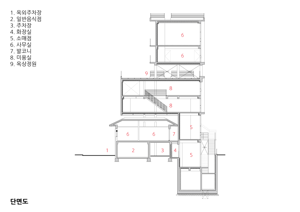 HANNAH HAUS(Pre&Schematic designed b y Jong Seok Kim at COOM PARTNERS) - presents a new form of recyclable alternatives which maximizes spaces and commercial potential, simultaneously minimizes the psychological disunity b y embracing the passage of time. The general aim of typical recyclable alternatives is t o fix an existing old building and t o pursue a maximum profit by enlarging it out of fulfilling the maximum volume and the coverage ratio. On the contrary the HANNAH HAUS not only takes advantages of this substantial condition but also narrows the interval embedded within 37 years. For instance, the aesthetics of simplicity and a sense of balance and harmony, transforms the space int o a very flexible space. The new form of building keeps the scarlet-coloured roof tiles as well as the landscape gardening space i n order t o imply a trace o f time. The architectural decision can be also understood as a creative and spatial endeavor in order to minimize a sense of emotional anxiety while maximizing both the height and the scale. The eye-catching architecture located in Seorae Maeul(Seorae French Village in Seoul) consists of a large scale of concrete building including 2 basements and 6 floors: 25 meters in height.
