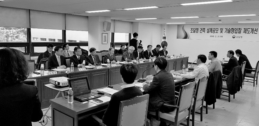 조달청이 건축설계입찰 시 관계전문기술자 ‘수급협정제도’를 개선하고, 심사의 전문성을 확보하기 위해 향 후 건축사협회와 심사위원 평가기준 등을 협의토록 검토하는 등 대한건축사협회의 건의사항을 수렴해 제도 개선을 해나가기로 했다. 정무경 조달청장은 2월 21일 오후 3시 서울지방조달청 중회의실에서 대한건축사 협회를 비롯한 관련 협회, 건축사사무소, 건설사 관계자와 ‘건축 설계공모 및 기술형입찰 제도개선 간담회’ 를 가졌다. 이날 대한건축사협회는 “조달청 설계 입찰 당선자가 확정되기 전에 건축사사무소 수에 비해 극 히 적은 관계전문기술업체와 수급협정을 맺지 못해 조달청 설계 입찰 참여 자체가 불가능한 경우가 다수 발 생하고 있다”며 “당선자 선정 이후에 조달청과 수의계약 전까지만 관계전문기술업체와 수급협정을 맺도록 수급협정 체결시기를 조정한다면 신진, 청년건축사의 진입장벽이 낮아지고 건축설계 입찰에 참여하는 건축 사사무소가 늘어날 것이며, 공정하고 현실적인 조달입찰 제도로 조달청 건축설계 품질이 강화될 것”이라 강 조했다. 이 밖에도 공공건축물 설계공모·입찰에서 디자인평가를 도입하는 문제, 설계공모 심사의 투명·공정 성을 높이기 위한 옴부즈만 도입, 감점·실격 사유 구체화, 교수 중심의 심사위원을 건축사 등으로 확대하는 방안 등을 논의했다. 또, 설계공모 확대(2020년 1월부터, 2억 원 → 1억 원 이상)에 따른 업계의 설계공모 부담 완화 방안도 추진키로 했다.