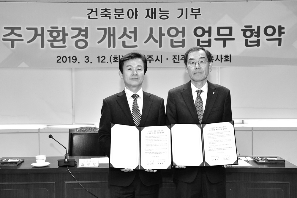 진주지역건축사회(회장 이종칠)와 진주시는 3월 12일 진주시청 5층 상황실에서 ‘건축분야 재능기부를 통한 주거환경개선사업’ 업무 협약식을 가졌다. 이날 협약식에는 조규일 진주시장과 이종칠 진주지역건축사회 회 장을 비롯한 건축사와 관계자들이 참석했다. 업무협약에 따르면, 진주시와 진주지역건축사회가 긴밀한 협력 을 통해 관내 저소득 주민들의 주거환경을 개선하고 함께 잘사는 지역사회를 만드는데 최선을 다하며, 사업 에 필요한 재정과 재능을 지원한다. 진주시는 사회취약계층을 대상으로 한 주거환경개선사업은 사회공헌 차 원에서 진주지역건축사회의 재정 및 재능 기부와 시의 행정적 지원을 기반으로 추진된다고 밝혔다.