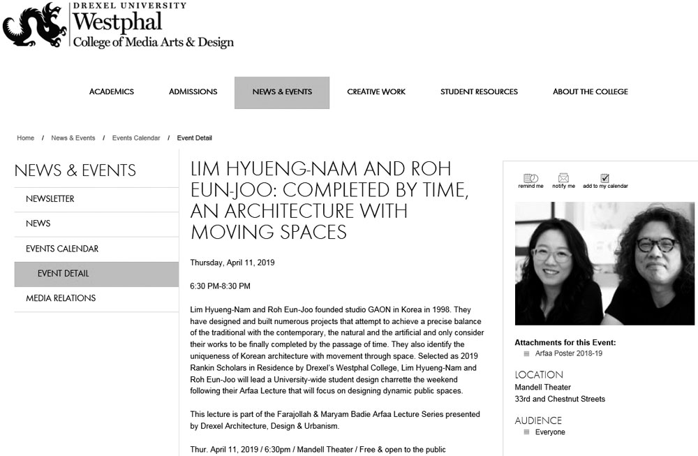 임형남, 노은주 본지 편집위원(건축사사무소 가 온건축)이 4월 11일 18시 30분 미국 드렉셀대 (Drexel University)에서 대학 전체 학생, 일반 인을 대상으로 건축사사무소 가온건축 작품을 주제로 한 초청강연회를 연다. 또 4월 12일부터 15일까지는 공공공간 설계 스튜디오 특별수업 을 학생·교수들과 함께 진행한다.
