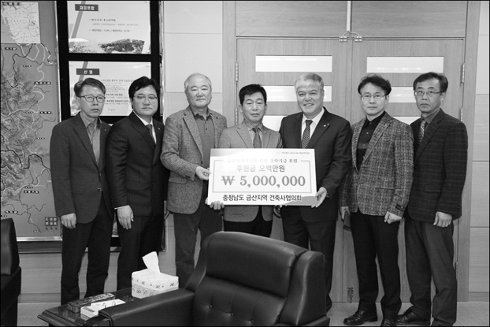 금산지역건축사회(회장 김석곤)는 3월 12일 금산군청 군수실에서 금산지역 인재육성을 위해 써달라며 금 산군수에게 장학기금을 전달했다.