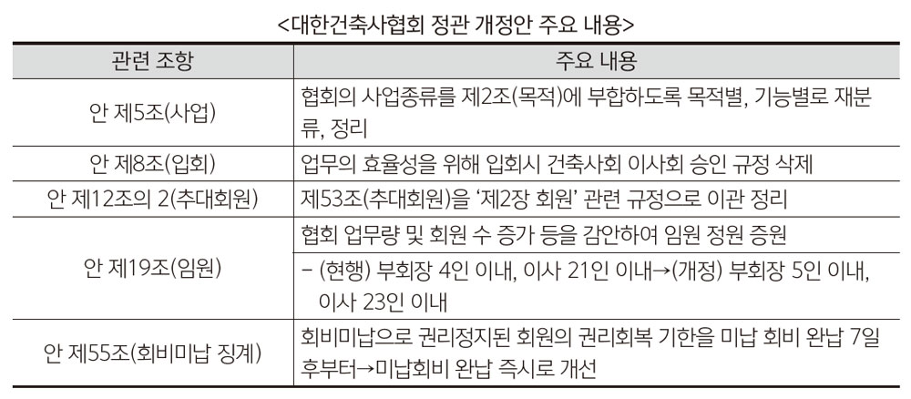 특히 이날 통과된 정관 개정안은 정부정책과 건축 환경 변화에 협회가 능동적이고 선도적으로 대처하기 위 해 재해, 재난 대비 상설기구 설치의 근거를 마련하고, 국민의 안전 확보와 건축사의 사회적 책임을 강화하 는 일환으로 추진됐다. 정관 개정안에 따르면, 입회 시 건축사회 이사회 승인조항을 삭제하고 회비 미납 권 리정지의 경우, 미납회비를 완납하면 즉시 입회할 수 있도록 하는 등 회원 서비스 증대와 회원의 협회 참여 기회를 확대할 수 있도록 관련 규정을 개선했다.