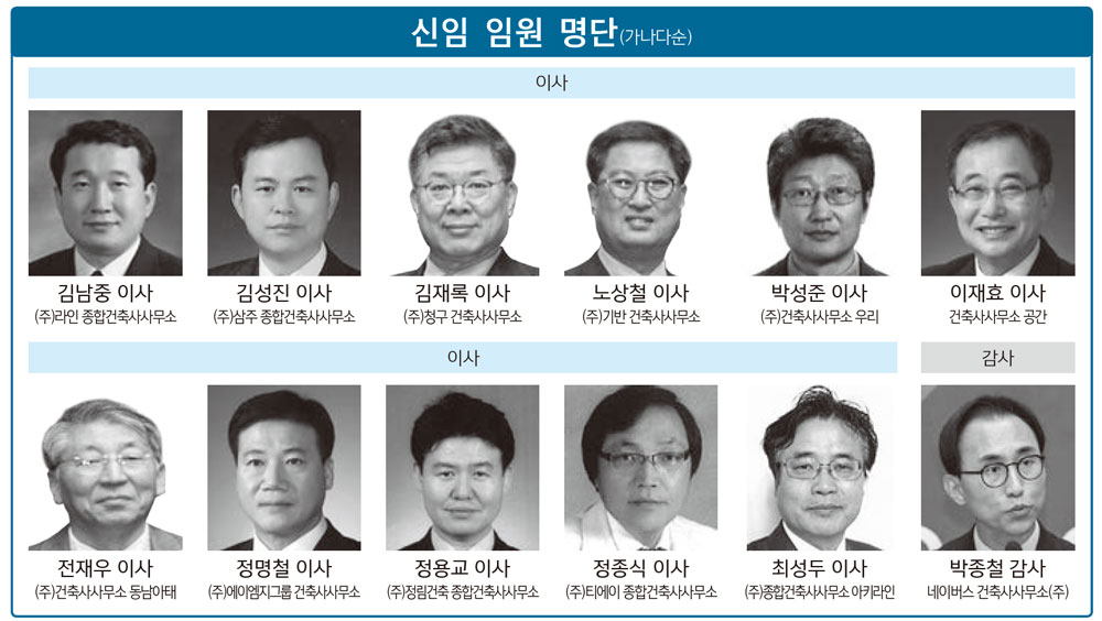 신임 감사에는 박종철 건축사(네이버스 건축사사무소.주)가 선출됐다. 박종철 신임 감사는 “우리 스스로 건 축사라는 것이 자랑스럽고 국민들로부터 인정받는 이름이 되기를 희망한다”면서 “대한건축사협회가 해야 할 일을 하는 협회가 되도록 적극 지원하겠다. 기본에 충실하고 정직한, 소통하는 감사가 되겠다. 그간의 경 험을 바탕으로 협회와 회원을 위한 든든한 감사가 되겠다”고 말했다. 신임 이사로는 김남중(주.라인 종합건축사사무소), 김성진(주.삼주 종합건축사사무소), 김재록(주. 청구 건축사사무소), 노상철(주.기반 건축사사 무소), 박성준(주.건축사사무소 우리), 이재효(건축사사무소 공간), 전재우(주. 건축사사무소 동남아태), 정 명철(주.에이엠지그룹 건축사사무소), 정용교(주.정림건축 종합건축사사무소), 정종식(주. 티에이 종합건축 사사무소), 최성두(주. 종합건축사사무소 아키라인) 건축사 등 총 11인이 선출됐다. 정관 개정안이 통과됨 에 따라 추가 선출되는 이사 2인은 정관개정안이 국토교통부장관으로부터 인가되면 인가되는 시점부터 임 기가 개시되는 조건으로 회장에게 위임하기로 했다.