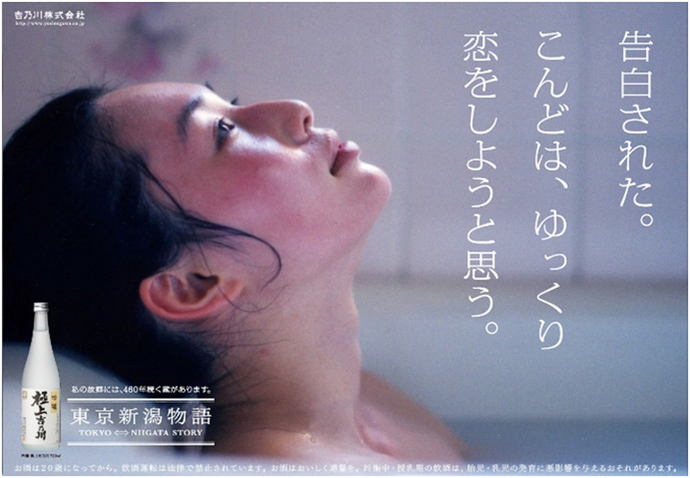 나는 몸에 딱 붙는 원피스를 입은 유명 여자 연예인이 신나게 춤을 추며 한 잔 하 라고 권하는 소주 광고보다, 자극적이지 않은 요시노가와의 사케 광고를 볼 때 술 생각이 더 난다. 나이 때문이라고 할 수만은 없는 것이 요시노가와의 메인 타 겟은 20대의 젊은 남녀 회사원이다.