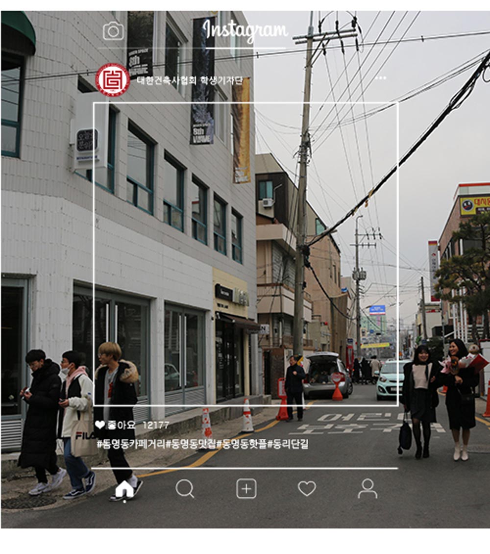 2000년대 초 동명동 일대는 한때 학원가로 명성을 떨쳤다. 학원에 아이들을 바 래다주던 학부모들이 잠시 시간을 보내며 기다릴 곳이 필요했고, 카페는 그 역할 로 꽤 적당한 장소였다.(그것이 시작이었다.) 오랜 시간 자리해왔을 학원빌딩 1 층에는 깔끔하게 정리된 카페가 대거 등장하게 되었고, 3∼4층 규모의 빌딩들 사이로 카페 간판들이 보이기 시작했다. 또한 최근에는 대형 프랜차이즈 대신 2 ∼30대 젊은 세대의 취향을 저격한, 소위 ‘인스타 감성’을 품은 카페가 급증했다. 예쁜 카페 사진들과 맛있는 음식들로 도배된 SNS는 동명동 카페거리의 인기를 실감케 한다.