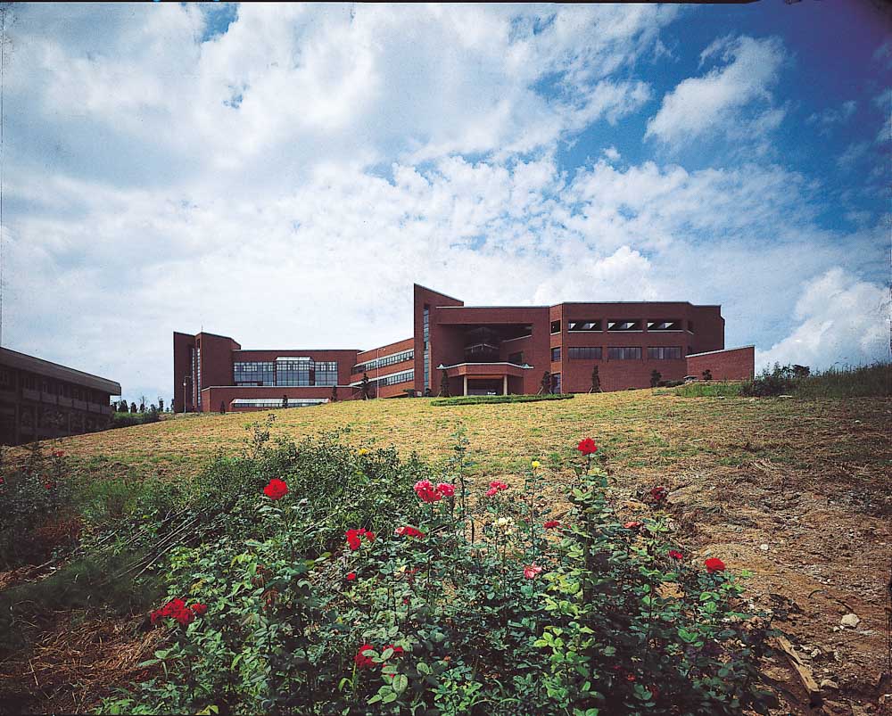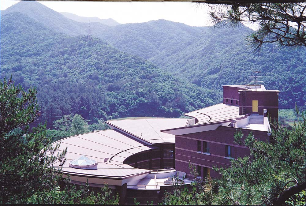 우선 산등을 깎아서 만든 땅의 형상을 그대로 이용하여 현관의 오른쪽은 계단 식 시청각실을 배치하고 왼쪽에는 휴게실(때에 따라서는 전시공간으로 활용) 을 계획했다. 2층에는 탁 트인 풍경을 조망할 수 있는 테라스를 두었고, 학생식 당과 개인연구실을 각각 배치하였으며, 각 기능에 대응하도록 건물 여러 부분 에 출입문을 설치하였다. 또한 3층 공간은 학생 심신 수련장인 연수실과 회의 실 등을 구성했는데, 크고 작은 테라스를 적절히 배치하여 최대한 학생들의 시 간 외 개별공간의 기능을 부여하고자 했다. 결과적으로 다양한 프로그램을 위 해 평면은 다각이 되었고, 입구가 여럿이며, 접근 레벨이 2개 층에 걸쳐 형성된 셈이다.