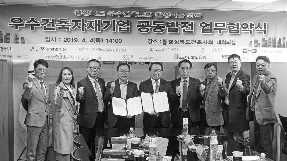 경상북도건축사회가 지역건축문화 발전을 위한 업무협약식을 맺었다. 대한건축사협회 경상북도건축사회는 4 월 4일 경상북도 안동시에 위치한 경상북도건축사회 대회의실에서 지역 내 우수 자재업체 10개 사와 ‘경상북 도 우수건축문화 활성화를 위한 우수건축자재기업 공동발전 업무협약식’을 체결했다. 이날 경상북도건축사회 방재원 회장과 송동훈 부회장 등은 참가업체 대표들과 다과를 즐기고 기념촬영을 했다. 업체 측에서는 ▲(주) 경원알미늄 ▲(주)대상테크롤 ▲보현석재(주) ▲(주)한양엔티 ▲(주)ADD 웰빙테크 ▲(주)상신 ▲(주)스타빌 엔지니어링 ▲(주)온새미로 ▲라인강건산업(주) ▲(주)광스틸 대표 등이 참석해 업무협약서에 서명했다.