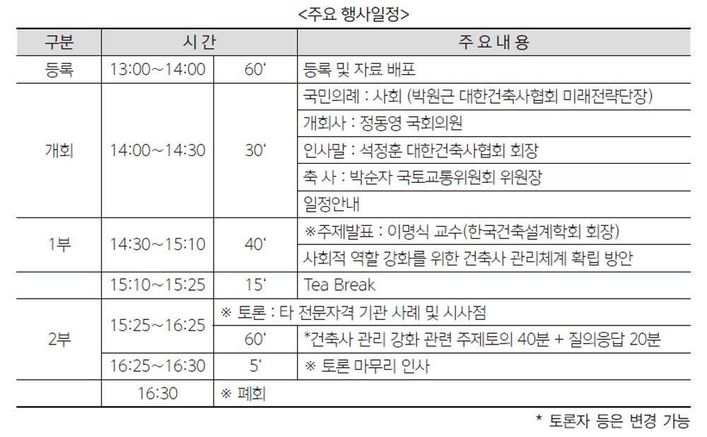 발제는 이명식 동국대학교 건축학과 교수(한국건축설계학회 회장)가 맡아 ‘사회적 역할 강화를 위한 건축사 관리체계 확립 방안’에 대해 주제발표를 하고, 박경립 한국건축정책학회 명예회장이 좌장을 맡은 토론회는 ▲이경석 국토교통부 건축문화경관과장 ▲박경서 서울특별시 건축기획과 과장 ▲김현준 강원대학교 건축 학부 교수 ▲전재우 대한건축사협회 조사위원회 담당이사 ▲윤홍연 사이다건축사사무소 대표 ▲김기중 새 건축사협의회 부회장 ▲원영섭 대한변호사협회 변호사 ▲이영종 한국건축가협회 법제도건축위원장이 참여 한다.