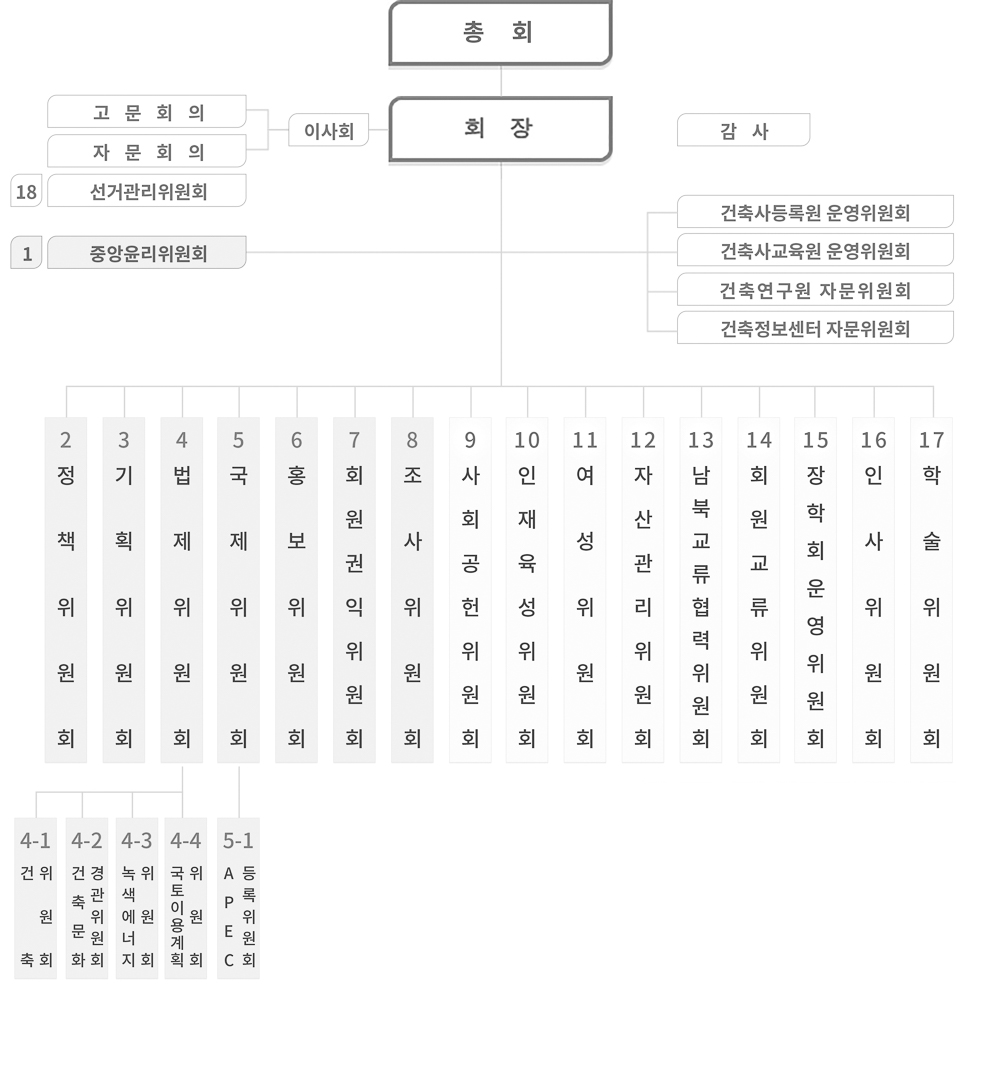 올해 운영되는 상설위원회는 총 18개다. 기존의 ‘50년사발간위원회’가 폐지되고 ‘학술위원회’가 신설됐다. ‘건축사등록원운영위원회’와 ‘건축사교육원운영위원회’, ‘건축연구원자문위원회’, ‘건축정보센터자문위원 회’ 등 4개 위원회는 별도의 운영규정에 따라 구성됐다. ‘대한민국건축사대회조직위원회’와 ‘한국건축산업 대전집행위원회’, ‘서울국제건축영화제 집행위원회’ 등 3개 위원회는 협회 주요 행사를 담당하게 된다. 이밖 에도 ‘건축문화대상시행위원회’나 ‘FIKA’ 등과 관련된 6개 위원회가 별도로 구성됐다.