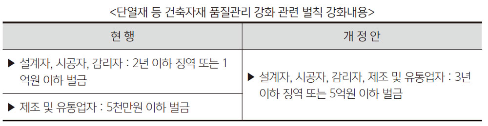 건축물의 마감재료 기준 위반, 품질관리서 미제출, 불량한 건축자재 유통 등의 행위에 대한 벌칙도 강화됐으며, 단열재에 대한 위변조 방지를 위해 자재정보를 표면에 표시하는 것이 의무화됐다.