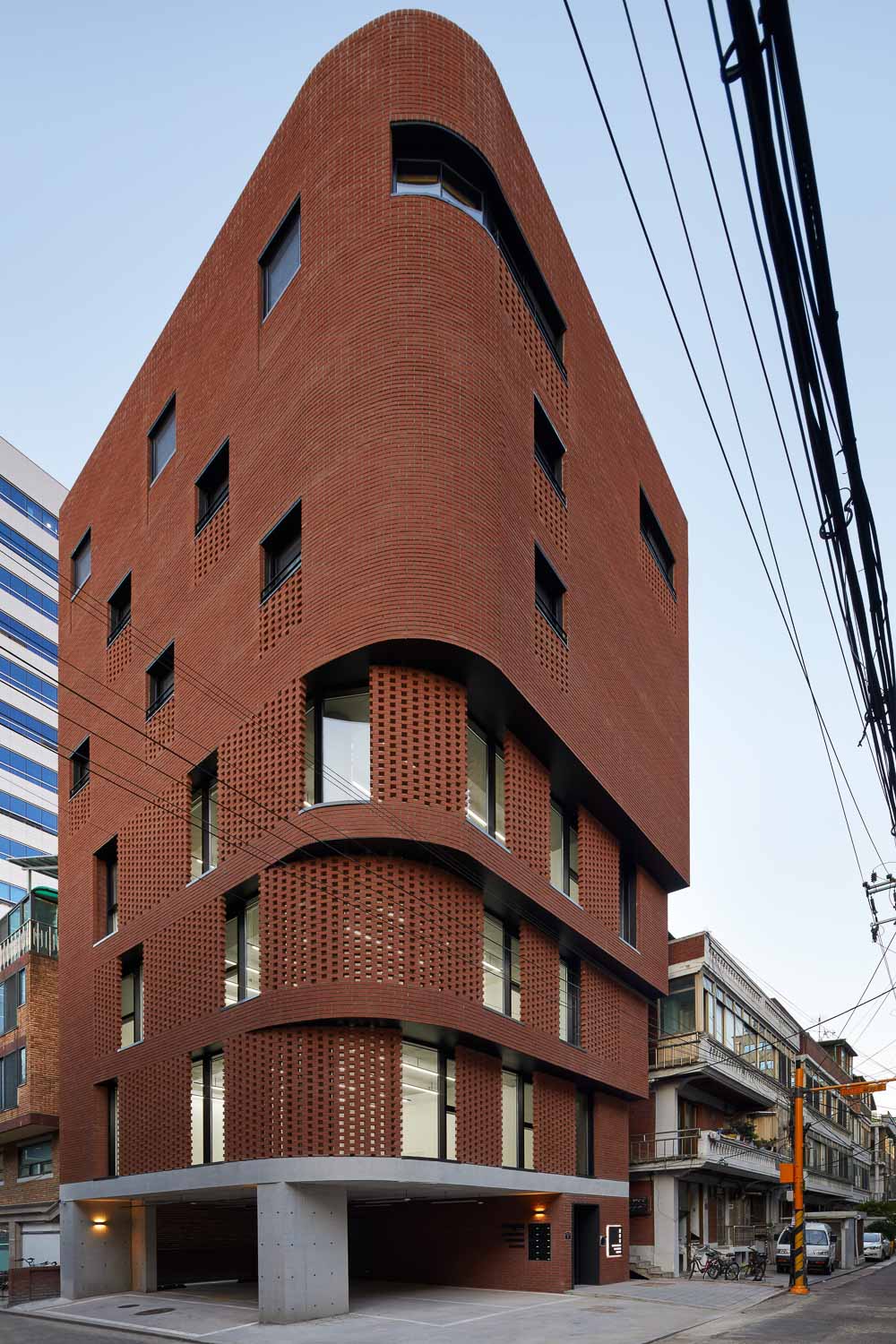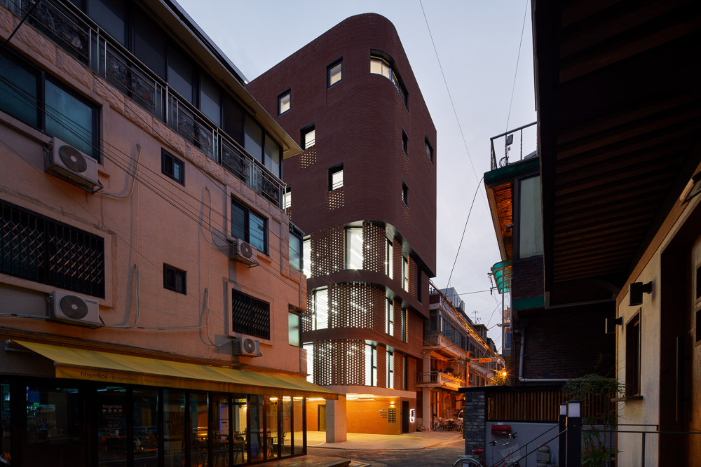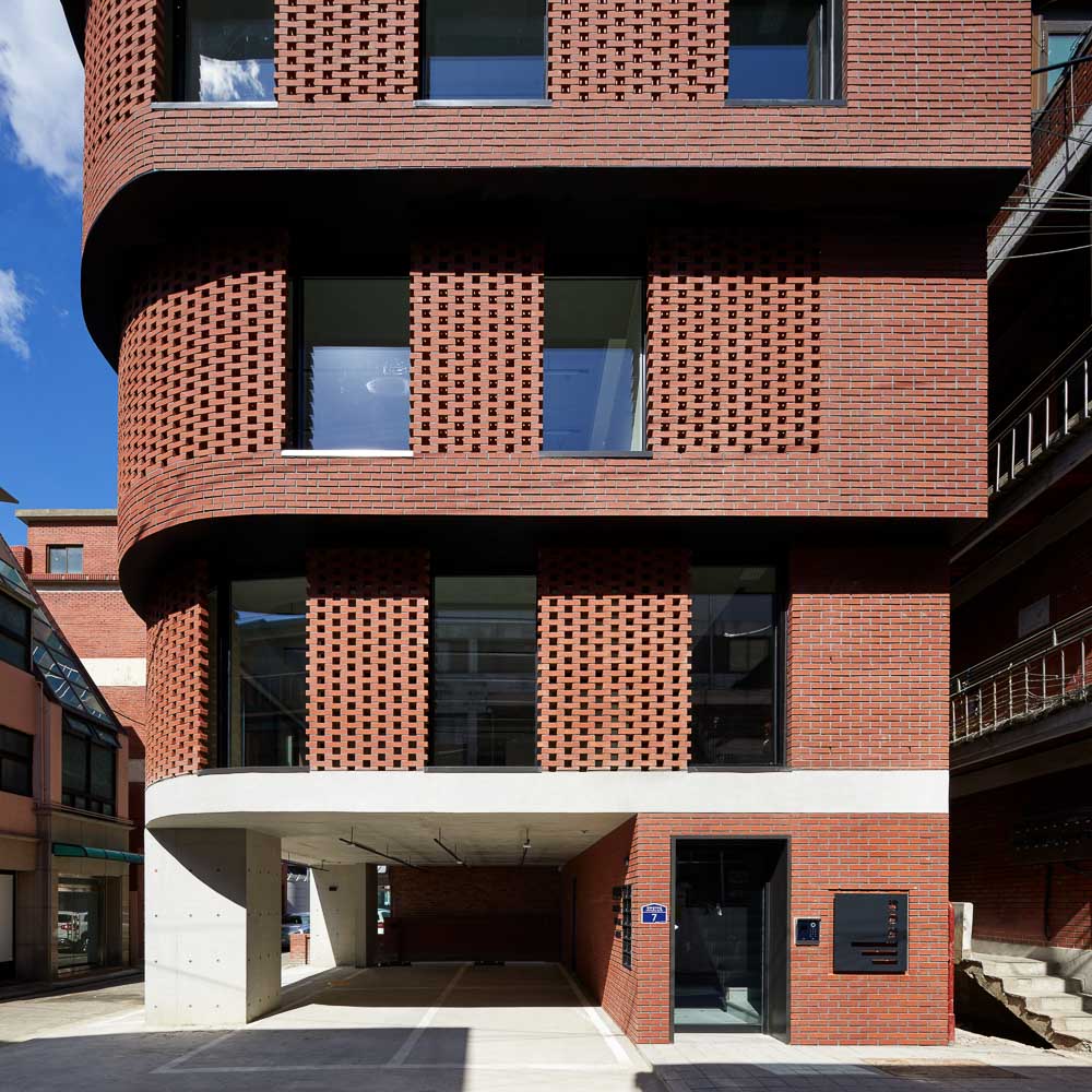 When you look down at Seongsu-dong from Subway Line 2, you will notice that small and large red brick buildings are mixed in Seongsu-dong. Although 3/1 Building has a shape different from other urban contexts, 3/1 Building tries to reflect the past memory through materials and be in harmony with surrounding buildings. Although 3/1 Building uses the past material, the building considers about the new program and build bricks in a unique way. To express the co-existence of two different programs, 3/1 Building has a different density in laying brinks. The commercial areas in the lower floors are designed with double-skin curtain wall to maximize the sense of openness in relatively narrow indoor space. Also, the residential areas in the upper floors have less windows in consideration of visual interference from surrounding buildings. Such brickwork acts as a screen which allows the light to come inside the building while protecting the privacy of the neighbors.