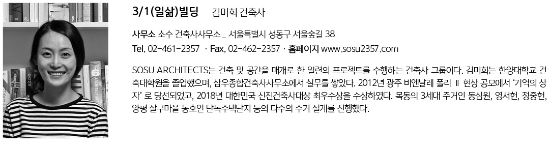 지하철 2호선을 타고 내려다보는 성수동은 크고 작은 붉은 벽돌 건물들이 혼재 된 모습니다. 3/1(일삶)빌딩은 기존의 도시 맥락에서 이질적인 형태의 건물이 지만 재료를 통해 과거의 기억을 담고 기존 주변 건물과의 조화를 이루고자 한 다. 과거의 재료를 이용하지만 새로운 프로그램을 고려하여 기존과는 다른 방 식으로 조적하고자 했다. 두 가지 서로 다른 프로그램의 공존이 입면에서도 드 러날 수 있도록 벽돌 쌓기의 밀도를 다르게 했다. 저층의 상업시설은 이중외피 의 커튼월로 계획하여 다소 좁은 실내 공간의 개방감을 극대화하고 고층의 주 거 시설은 향후 주변 시설과의 시각적인 간섭을 고려하여 창 계획을 최소화했 다. 벽돌의 다양한 쌓기 방식으로 기존의 막힌 벽들은 빛을 받아들일 수 있도록 열리는 동시에 주변 이웃들의 삶이 지키질 수 있도록 스크린의 역할을 한다.