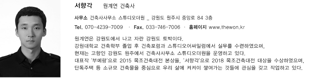 | 서향각 설계자 _ Architect. 원계연 _ Won, Gyeyoen 건축사사무소 스튜디오더원 _ studio thewon 건축주 | 박탄, 이효숙 감리자 | 원계연 시공사 | 김민수, 김민기 설계팀 | 이제선 대지위치 | 강원도 원주시 판부면 서곡리 주요용도 | 단독주택 대지면적 | 438.00㎡ 건축면적 | 147.50㎡ 연면적 | 124.60㎡ 건폐율 | 33.68% 용적률 | 28.86% 규모 | 지상 1층 구조 | 철근콘크리트조(기초) + 경량목구조(1층,지붕) 외부마감재 | 0.7T 알루미늄, 시멘트사이딩, 콘크리트노출,타일 내부마감재 | 12T 레드파인, 강마루, 타일, 한지 설계기간 | 13개월 공사기간 | 7개월 사진 | 박완순 전문기술협력 구조분야 : 나라구조 기계설비분야 : (주)신화엔지니어링 전기분야 : (주)신화엔지니어링 |