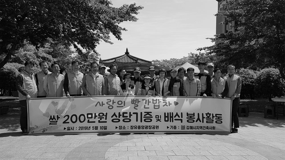 김해지역건축사회 회원들은 5월 10일 경남 김해 장유 중앙광장공원에서 경제적 어려움으로 식사를 하지 못 하는 이들과 홀몸 어르신 등에게 식사를 나누어주는 ‘사랑의 빨간밥차’ 봉사활동을 펼쳤다. 이날 행사에 참 여한 회원 10여 명은 배식 활동 외에도 200만 원 상당의 쌀을 ‘사랑의 빨간밥차’ 사업에 기증했다. ‘사랑의 빨간밥차’는 사단법인 사랑의쌀나눔운동본부중앙회에서 진행하는 무료급식 지원사업이다.