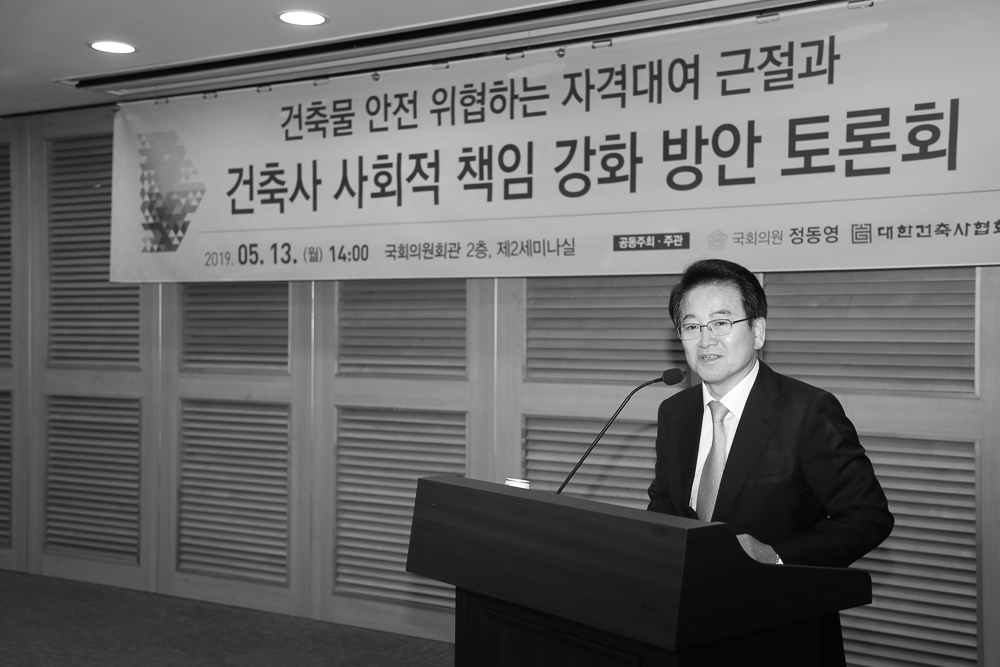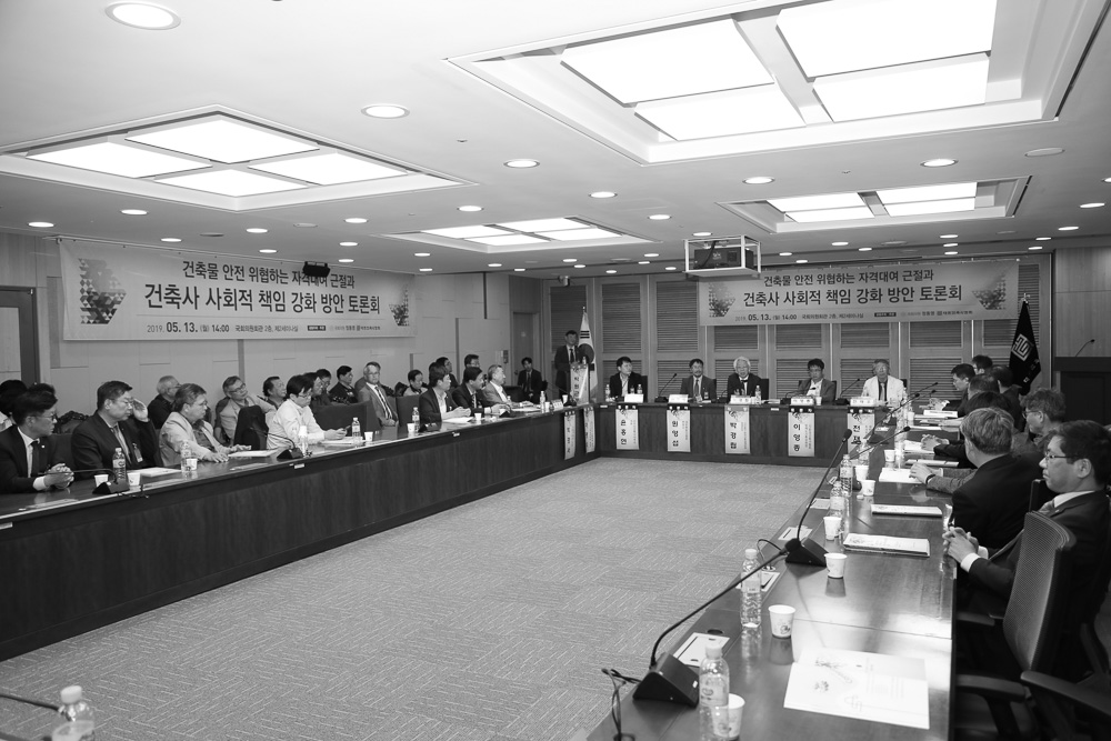 정동영 국회의원과 대한건축사협회 공동주최·주관하에 정부·지자체·건축계가 한데 모여 ‘건축물 안전을 위 협하는 자격대여 근절과 건축사 사회적 책임 강화 방안’에 대해 논의하는 자리가 마련됐다. 토론회에서는 현 건축계의 현실진단과 반성, 국민들이 건축사를 바라보는 시각을 겸허히 받아들여 왜곡된 편견을 바로잡 고, 미래세대를 위해 무엇을 해야 할지에 대한 다양한 의견이 오갔다. 시장에서 벌어지는 자격대여·설계비 덤핑 등 여러 문제를 풀기 위한 건축사 업무의 공공성 강화와 윤리확보 방안에 대한 시스템적 접근이 필요하 고, 국민 신뢰를 높이기 위해선 건축사협회 의무가입, 표준계약서 개정·다양화 등 우선 실천가능한 것부터 시작해야 한다는 주장이 제기됐다.