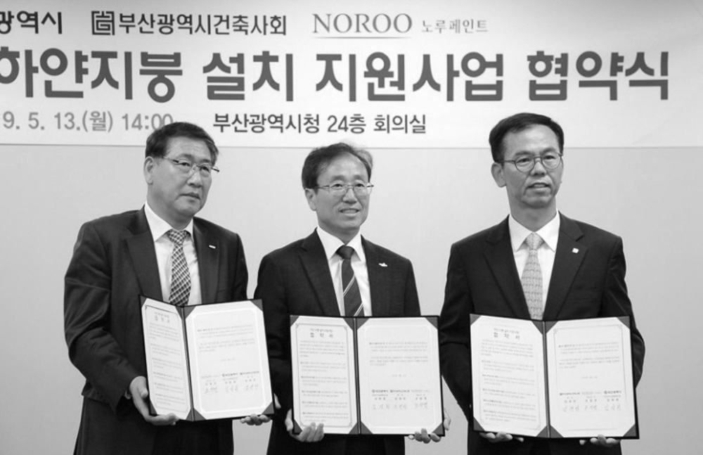 부산광역시건축사회는 5월 13일 부산광역시가 추진하는 ‘하얀 지붕 설치 지원사업’ 업무협약을 체결하고, 주거용 지붕에 반사효과가 있는 밝은 색 도료를 입혀 도시 열섬현상을 완화하는 녹색 건축 실현에 나섰다. 사업대상지는 중구와 사하구의 폭염 취약 주택 22개 동이며, 5월부터 사업을 본격 시행한다. 협약에 따라 부산광역시건축사회는 직접 지붕 시공에 참여해 재능 기부를 실시하고, ㈜노루페인트는 차열 특수페인트 등 재료를 지원할 예정이다.