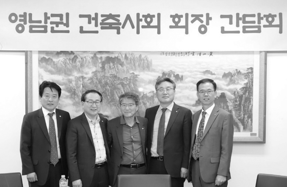 영남권 건축사회(울산·부산·대구·경북·경남건축사회) 회장 간담회가 지난 5월 3일 울산건축사회관에서 개 최됐다. 간담회에는 김영호 회장(울산)을 비롯해 김경만(부산), 공정섭(대구), 방재원(경북), 김재석(경남) 시도건축사회장이 참석했다. 회의에서는 ▲감리업무협약 세부내용 검토 ▲설계의도구현 제도 정착화 방안 ▲현장조사·검사 및 확인업무대행 수수료 현실화 방안 ▲건축행정시스템 운영규정 개정을 통한 세움터 수 수료 징수 ▲역량 있는 건축사에 대한 법제처 회신관련 ▲건축사 업무 범위 및 대가기준 현실화 ▲건축위원 회 심의도서 감축 및 간소화 추진 등 각 시도에서 역점 추진 중인 현안의 심도 있는 논의가 이뤄졌다. 이날 논의된 내용 중 건축계 전반에서 개선이 요구되는 안건들은 대한건축사협회에 제안 또는 전국 시도건축사회 회장 회의 등을 통해 발전시켜나갈 예정이다.