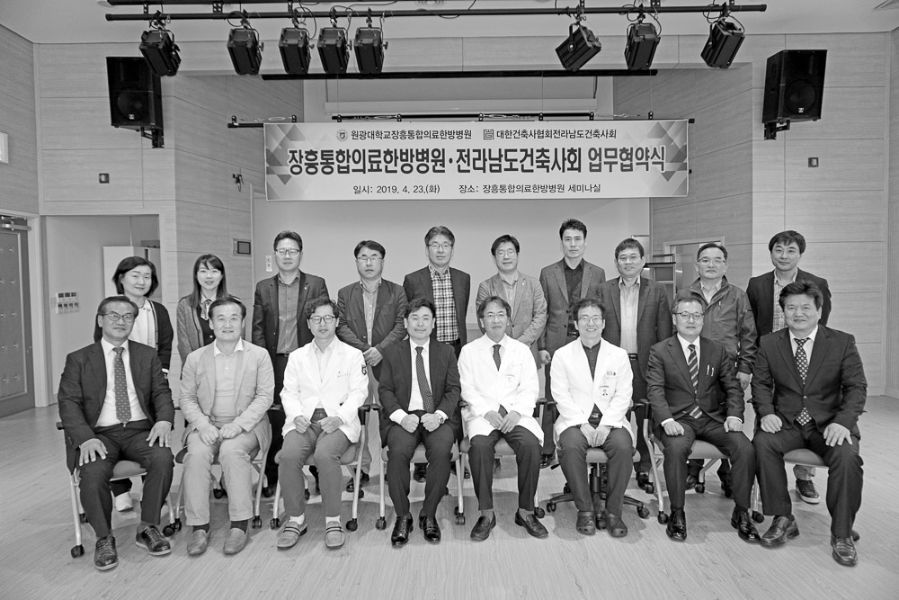 전라남도건축사회는 4월 23일 국공립병원인 장흥통합의료한방병원과 업무협약을 맺고 상호 협의를 통한 협력 증진을 지속적으로 도모하기로 했다. 전라남도건축사회는 국민보건복지향상을 위해 장흥통합의료한 방병원을 적극 홍보하고, 장흥통합한방병원은 전라남도건축사회의 구성원(회원 및 직원)과 구성원의 직가 족 진료시 진료 할인을 제공한다. 또 양측은 지역사회 공헌을 위한 각종 행사시 상호 홍보 및 협력을 다할 방 침이다.