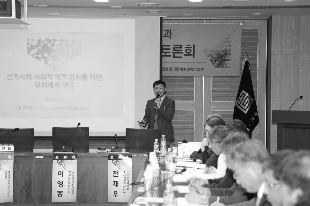 가장 먼저 발제자로 나선 이명식 동국대학교 건축학과 교수(한국건축설계학회장)는 ▲전문직으로서 건축사 윤리의 의의와 중요성 및 사회적 역할 ▲선진 외국의 건축사제도 사례분석 ▲건축사 업무의 공공성·윤리확 보를 위한 건축사협회의 역할 ▲건축사 관리체계 제도개선 방안을 발표했다. 건축사가 전문가로서 위상 재 정립을 위해 사회적 역할 포지션을 어떻게 가져가야 할지, 그에 맞춰 윤리강화를 위해선 어떤 제도적 개선이 필요한지, 선진 외국과 비교했을 때 지금 우리 현실이 어디쯤 와 있는지 요약정리해 설명했다.