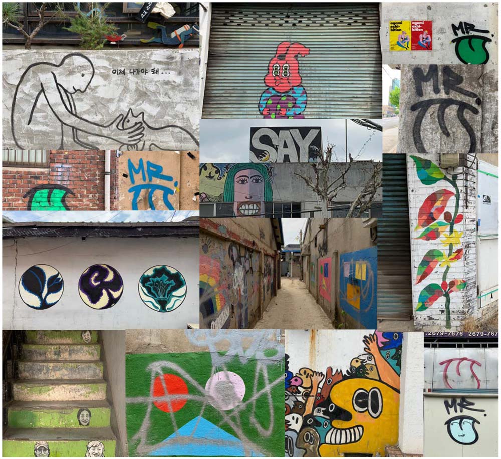 문래동에 갔을 때 제일 눈에 들어왔던 건 곳곳에 있는 벽화였다. 예술과 철공소가 공존하는 문래동에서 예술가들이 철공소의 철문부터 시작해서 건물의 외관, 가로등, 계단, 골목 골목에 자신들의 세계를 펼치고 있었다. 특히 수많은 벽화 중 문래와 메롱의 언어유희를 보여주는 다양한 크기와 색을 가진 글씨 MR과 메롱그림을 볼 수 있 을 것이다. 길을 걷다 곳곳에서 발견할 수 있었고, 어느새 다른 메롱을 찾으면서 길을 걷고 있었다. 문래동의 기억이 벽화를 통해 강하게, 자연스럽게 자리잡아 좋았다.