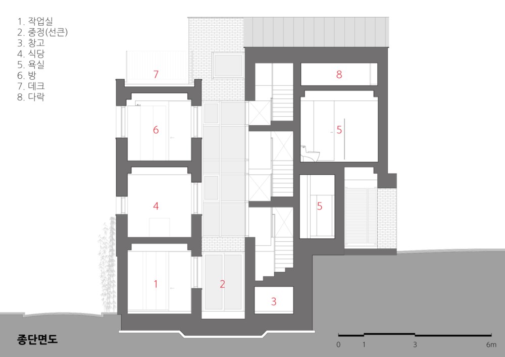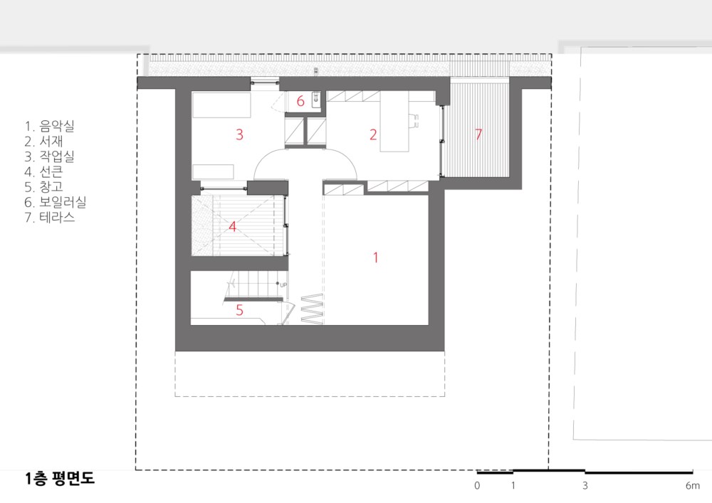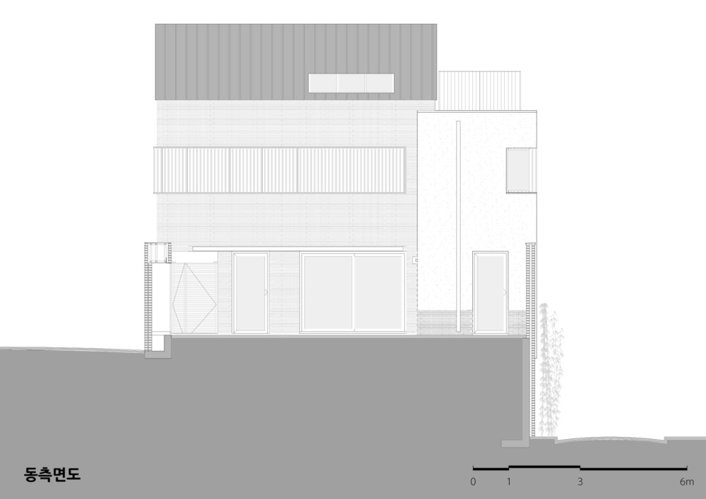 우리는 이 집이 꾸밈없이 담백하고 주변과 동화되어 자연스럽게 어울리는 집이 되길 희망하며 계획했다. 지하층은 북측에 위치한 막힌 3m 도로에 면하며 부부의 취미실로 사용된다. 도로에 면한 부분에 대나무를 이용해서 프라이버시를 보호하면서 내부에서 바라보는 길의 풍경과 주변 공간을 풍요롭게 보이도록 계획했다.