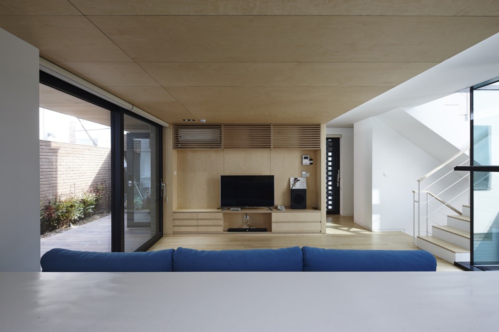 The first floor consists of living room and kitchen. There is a small yard in front of the living room in the east. The second floor consists of master bedroom and children's room. We partly use aluminium louver for their privacy. The attic is designed for children's play room and is in front of wood deck on rooftop. When planning the attic, we keep our mind on visual connection between attic floor and family room on the second floor.