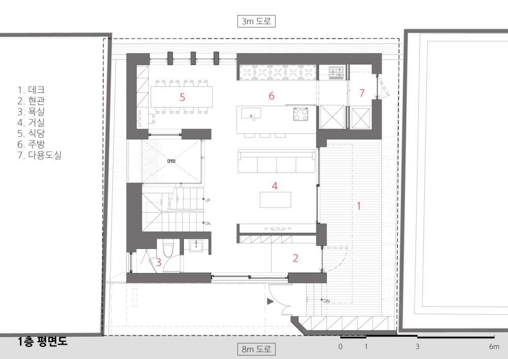 The “HO(好)” from HO HO JAE(好 好 斎) has meaning of “good” in Chinese character. By using this word twice in a row, we hope that this house would be a perfect place to live. HO HO JAE is a urban detached house with three stories above ground and one underground level for a family of five, husband, wife and three children. The house has land area of 133.20㎡(40 pyeong), which is faced to 8m-wide road to the south and 3m-wide dead-end road to the north.