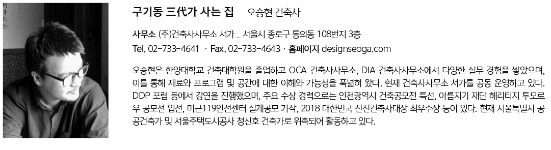 | 구기동 三代가 사는 집 설계자 _ Architect. 오승현 _ Oh, Seunghyun (주)건축사사무소 서가 _ Seoga Architects 건축주 | 유진순 감리자 | 오승현 _ (주)건축사사무소 서가 시공사 | 유진순 설계팀 | 박혜선, 정상호 대지위치 | 서울특별시 종로구 구기동 주요용도 | 단독주택 대지면적 | 236.32㎡ 건축면적 | 85.83㎡ 연면적 | 296.4㎡ 건폐율 | 36.32% 용적률 | 93.39% 규모 | 지하 1층, 지상 3층 구조 | 철근콘크리트조 외부마감재 | 치장벽돌(삼한C1 황토토담) 내부마감재 | 석고보드 위 수성페인트 도장, 이건 원목마루 설계기간 | 2017. 09 ~ 2018. 03 공사기간 | 2018. 04 ~ 2018. 10 사진 | 신해수 _ Studio texture on texture 구조분야 : (주)은구조 기계설비분야 : 수양엔지니어링 전기분야 : 수양엔지니어링 소방분야 : 수양엔지니어링 |