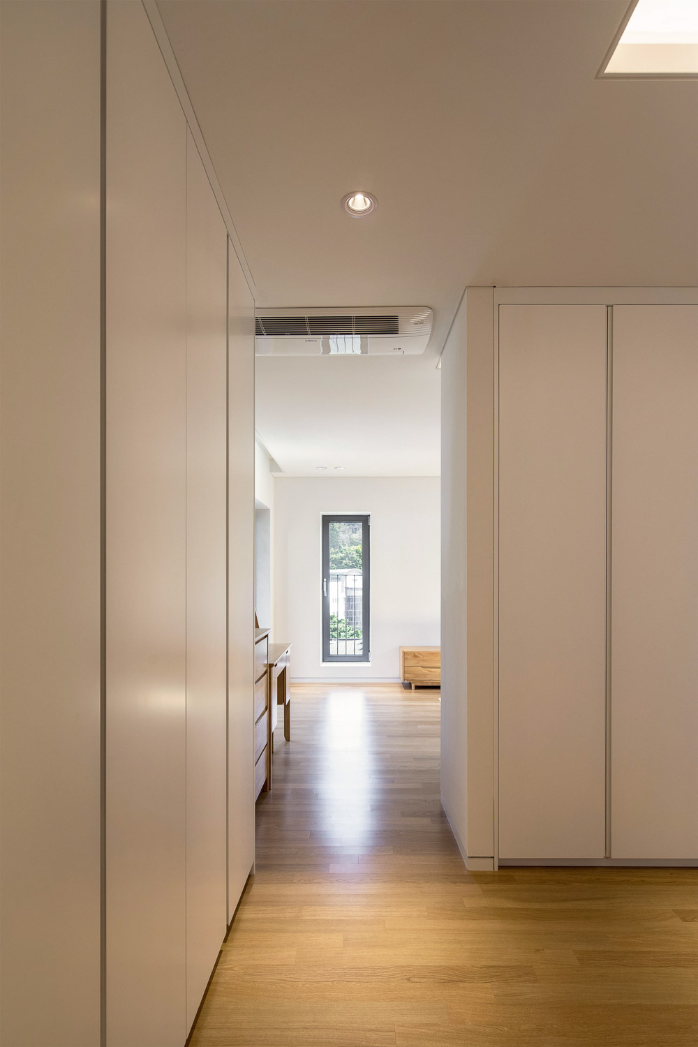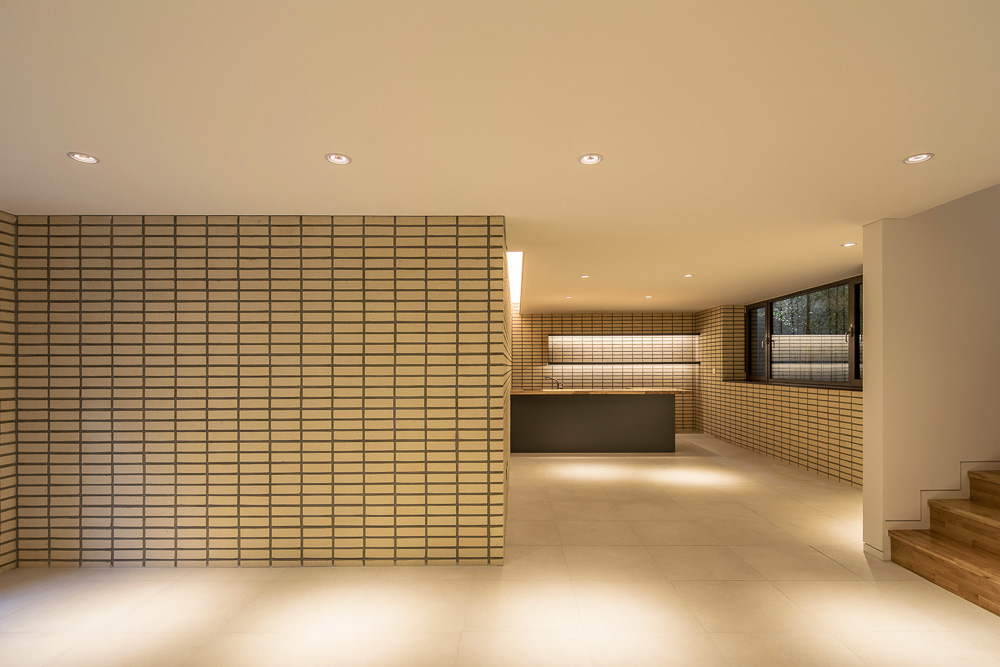 The second floor was planned as the owner’s household as well as the mother’s space, and the third floor was planned as the space of the newly wed son’s couple. A small living room and kitchen space were prepared in the space o f the newly married couple t o independent use. B y planning the individual spaces on the second t o third floors as rooms made up of bathrooms and dress rooms, the independence o f the private spaces o f each household wer e made t o be procured. Corridor-type dress rooms were placed at the entrance side of the rooms, and the spaces for the beds were deeply arranged from the entrance, constituting stable and well organized personal spaces. In this house, which is constituted of four 19- to 23-pyeong (62.8m² t o 76.0m²) stories, ther e ar e four bedrooms, two living rooms, two kitchens, six bathrooms as well as the family’s amusement space. I n the amusement space i n the basement, there i s a home bar where various alcoholic beverages are displayed, an exercise area where a ping pong table and fitness machines are installed, as well as a karaoke machine and drums. Although the designing process was complicated since diverse spaces, each of different characteristics, had t o be included, the house that was completed through the process of organizing the various opinions and contents became simple and concise. This house, made up of several households, contains various lifestyles. Over time, the members and lifestyle of the families will change once again, and they will grow old along with a house that can be a good background even in new situations.