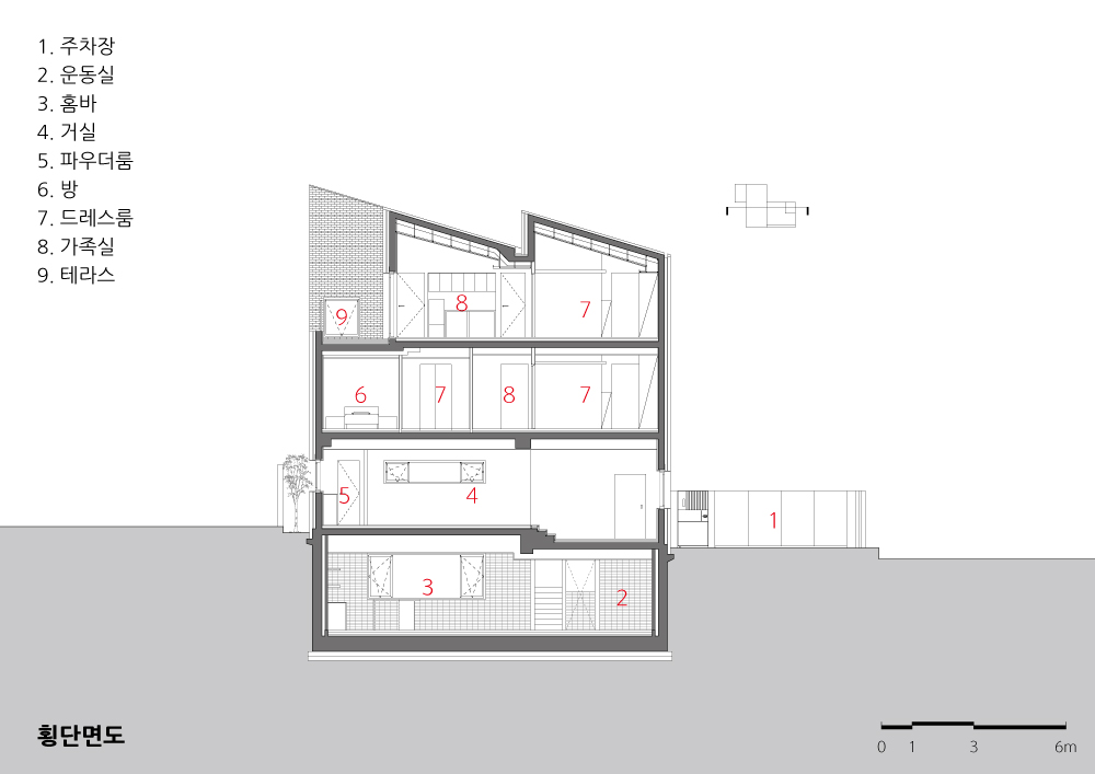 3대의 가족에게 필요한 공간을 구성하기 위해 지하 1층부터 지상 3층까지의 용적을 최대한 활용해야 했다. 현관에 들어서면 지하로 내려가는 계단과 집안으로 들어가 는 두 개의 입구가 있다. 지하 1층은 홈바와 운동실 등의 유희공간으로 이용하는 데, 외부 손님들이 방문할 경우 집안을 통하지 않고 바로 지하 1층으로 진입할 수 있도 록 계획했다. 지하 1층에는 두 곳의 선큰을 계획했다. 한 곳은 데크를 설치하여 유희 공간에서 잠시 나와 쉴 수 있도록 했으며, 다른 한 곳은 도로에 면해 있기에 차폐 식 재로 대나무를 심어 시각적 간섭을 차단하는 동시에 가로에 녹색 풍경을 만들어 주 었다. 또한 이러한 선큰 공간을 통해 지하 공간의 단점인 채광과 환기 문제를 해결할 수 있었다. 현관의 다른 한편으로 들어가면 처음 만나게 되는 공간은 주방이다. 대가 족이 사는 집에서 가장 사용빈도가 높은 주방을 현관 앞에 배치해 편리한 동선 구조 로 만들었다. 대지의 고저차로 인해 주방보다 높은 바닥에 거실을 배치했고 마당과 연결되도록 했다. 2층은 건축주 세대와 어머님의 공간으로, 3층은 신혼인 자녀부부 의 공간으로 계획됐다. 신혼 부부의 공간은 독립적인 사용이 가능하도록 작은 거실 과 주방 공간을 갖추었다. 2∼3층의 개인공간은 욕실 및 드레스 룸으로 구성된 방으 로 계획해, 세대별 사적 공간의 독립성을 확보하도록 했다. 방의 출입 측에는 복도식 드레스 룸을 배치하고, 침대가 놓이는 공간은 입구로부터 깊숙하게 배치하여 짜임 새 있고 안정된 개인공간으로 구성했다.