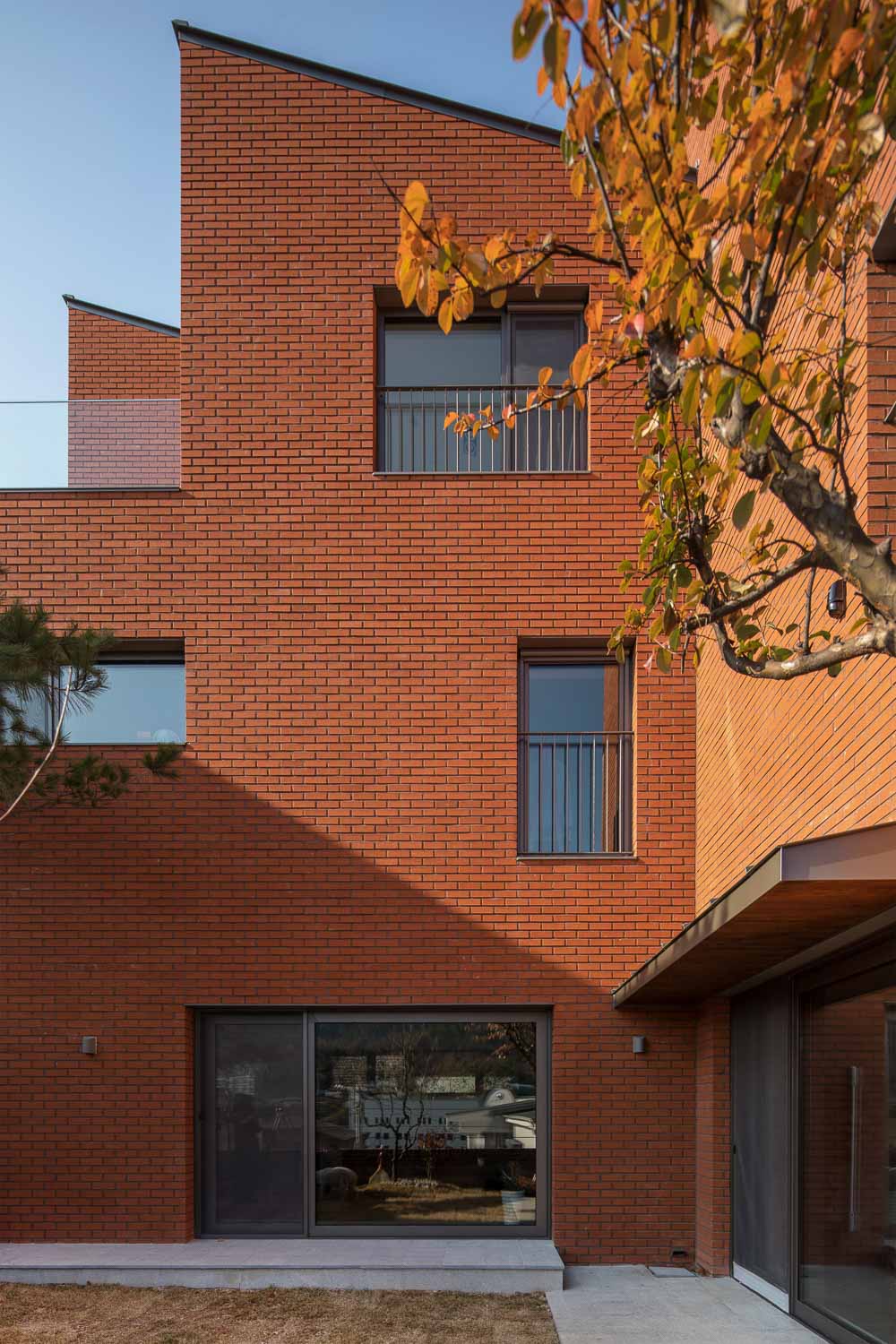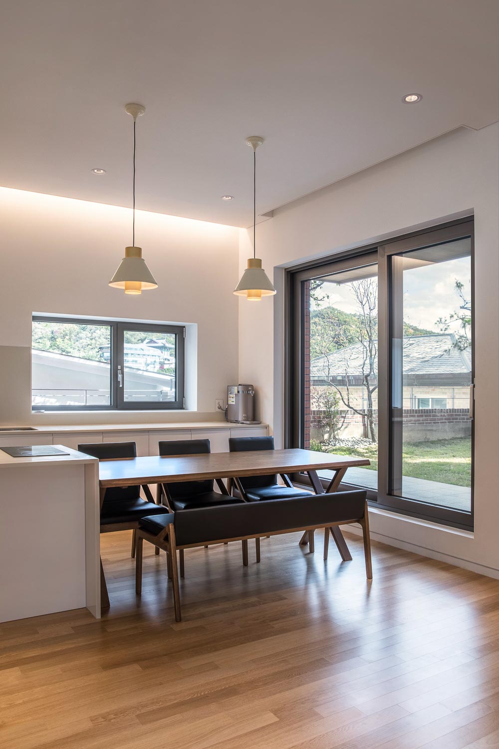 The project underwent with the two families (the owner couple and the soon-to-be married son’s couple). The consideration for each other and amongst families became a power that enriched the house. The shared space was planned through the process of freely gathering and mediating between the opinions of the families, and the individual spaces wer e planned b y reflecting the tastes of each household. Thus, the plan was made while picturing the change of welcoming a new family, as well as picturing the family’s appearance that will gradually change after five, ten years. The sit e is located at the slope of the Bukhansan. The formation and placement of the individual rooms were the most important t o make it possible for the landscape, where the summit of Bukhansan is stretched out, t o be enjoyed from as many spaces as possible. With the arrangement of the building placed in an L-shape, the exterior space is divided int o the outer yard and courtyard. The outer yard is used as the large family’s wide parking space as well as an entrance space. Also, the courtyard, which is connected t o the living room, dining room an d kitchen, etc., is a resting space of the family and a play space for the pet dog.