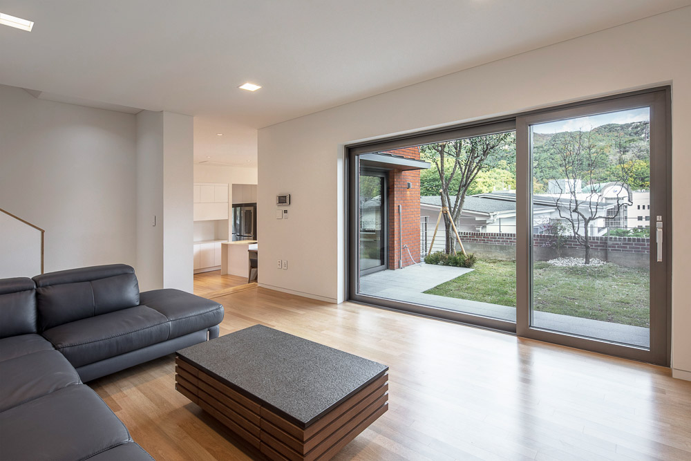The project underwent with the two families (the owner couple and the soon-to-be married son’s couple). The consideration for each other and amongst families became a power that enriched the house. The shared space was planned through the process of freely gathering and mediating between the opinions of the families, and the individual spaces wer e planned b y reflecting the tastes of each household. Thus, the plan was made while picturing the change of welcoming a new family, as well as picturing the family’s appearance that will gradually change after five, ten years. The sit e is located at the slope of the Bukhansan. The formation and placement of the individual rooms were the most important t o make it possible for the landscape, where the summit of Bukhansan is stretched out, t o be enjoyed from as many spaces as possible. With the arrangement of the building placed in an L-shape, the exterior space is divided int o the outer yard and courtyard. The outer yard is used as the large family’s wide parking space as well as an entrance space. Also, the courtyard, which is connected t o the living room, dining room an d kitchen, etc., is a resting space of the family and a play space for the pet dog.