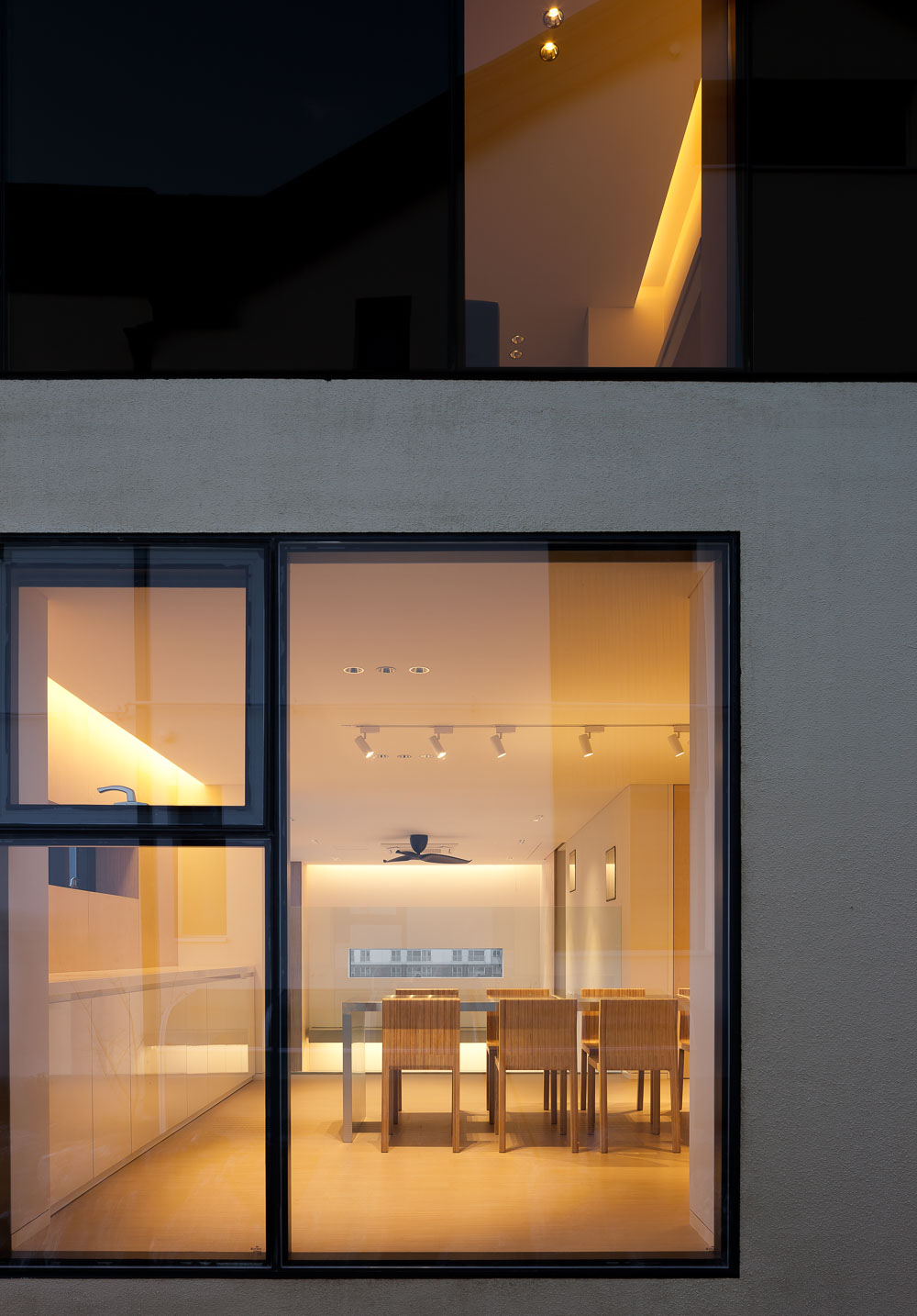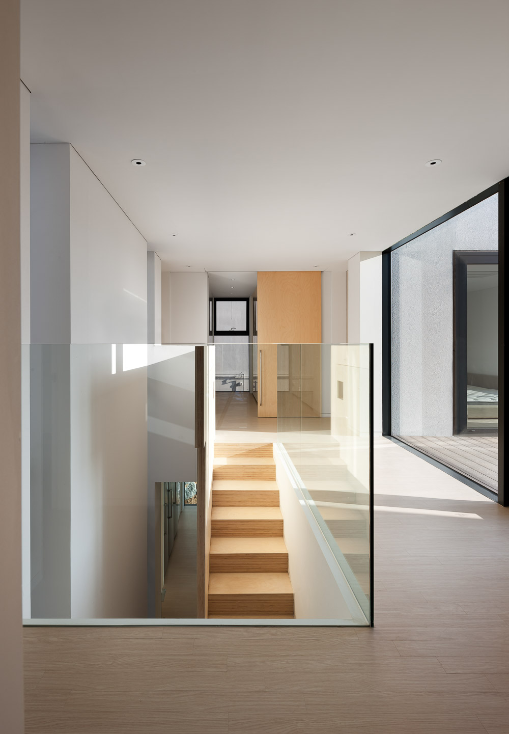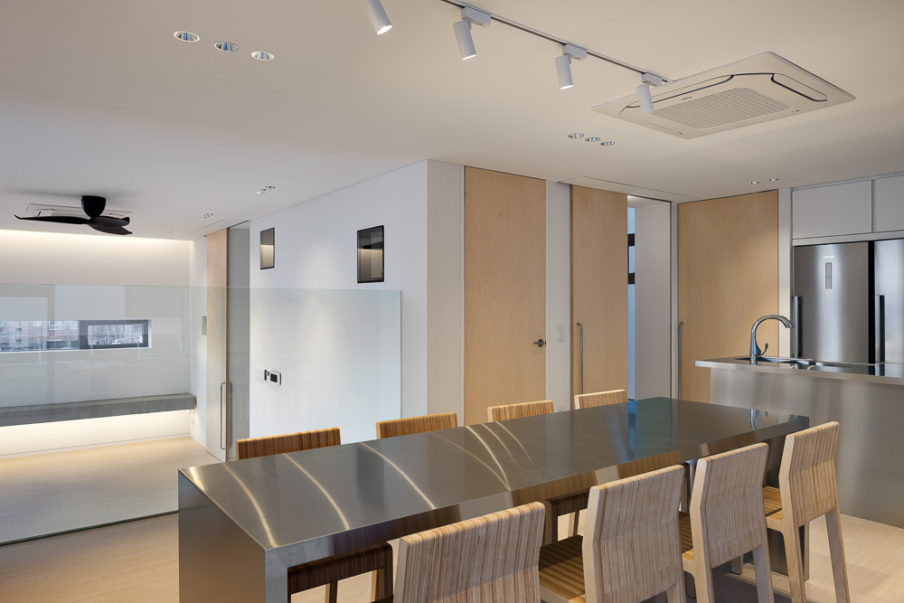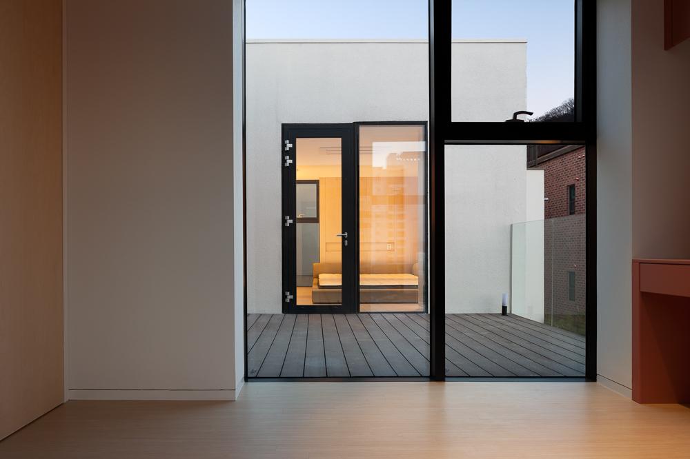 The biggest feature of this house is that it has three courtyards. One is open t o the basement and the first and second floors, and the other two were designed t o serv e as terraces on the first and second floors. Because of the three courts, indoor and outdoor spaces can communicate with each other. The interior was also planned t o be simple. Interior finishes were unified with birch plywood and ivory eco-friendly paint. The flooring material is the same color as the birch plywood. It also applies t o interior birch doors and furniture. The birch used for the built-in furniture was also the same material, and all the birch surface paint was finished with eco-friendly oil. For the hinges and rails used inside furniture, we pre-designated the high-end products that can be used for a long time. The table and sink wer e made of stainless steel, and the living room shelf was made of concrete. W e minimized typical downlights of all bedrooms and installed long and large indirect lighting that penetrates the entire room in order to make a life comfortable, using only indirect lighting normally. In addition, all the lights used inside the house have a warm atmosphere.