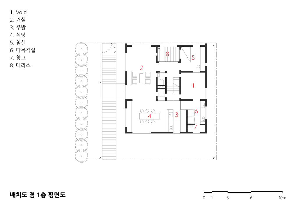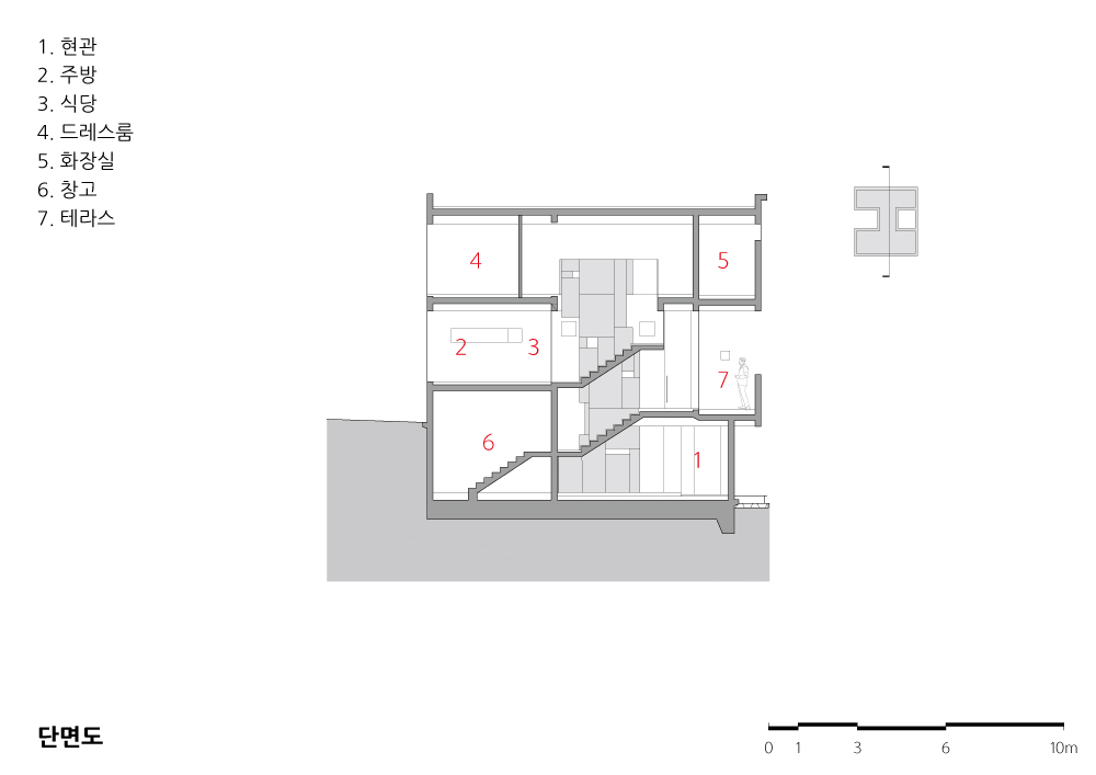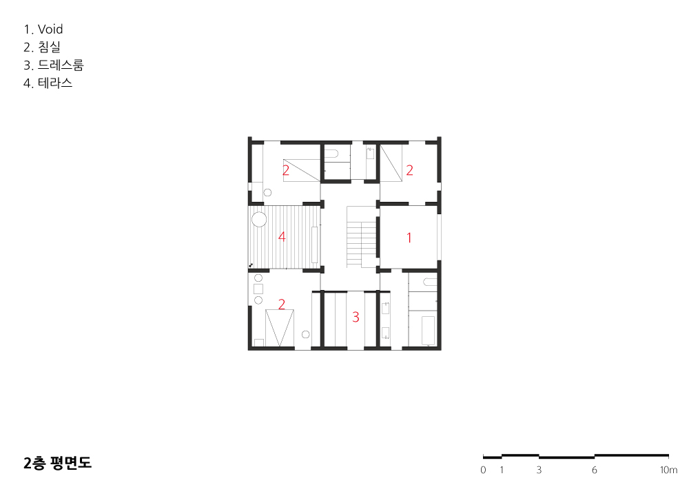 대지는 위례신도시의 단독주택 블록에 위치한다. 건축주 부부, 자녀들을 위해 설계된 주택이다. 건축주의 요구는 ‘높은 층고의 지하 다목적 룸’과 ‘높은 천장 의 거실’, ‘실내 주차장’ 등이었다. 대지의 레벨이 서측의 전면도로보다 1개층 정도 위에 위치하기 때문에 도로에서 건물로 진입하기 위해서는 지하층을 통 해 진입해야 하므로, 지하 1층, 지상 2층으로 집의 규모가 정해졌다. 대지가 정 사각형으로 정남향이었으므로 정남향으로 건물이 배치됐다. 가급적 외부공간 을 많이 확보하기 위하여 건물을 북측과 서측에 접하도록 했다. 남쪽의 공간과 건물의 진입은 도로가 있는 서측에서 이루어진다. 주공간(침실, 식당, 거실)을 모두 남측에 면하게 하기 위하여, 건물의 남측, 서측, 북측에 3개의 중정을 만 들었다. 중정을 통하여 모든 공간이 남쪽에 면할 수 있게 된다. 보조공간(화장 실, 샤워실, 세면실, 현관 등)은 북측으로 배치했다. 3개의 중정은 환기뿐 아니 라, 빛이 내부까지 유입되도록 하고, 하늘을 볼 수 있는 역할도 한다.