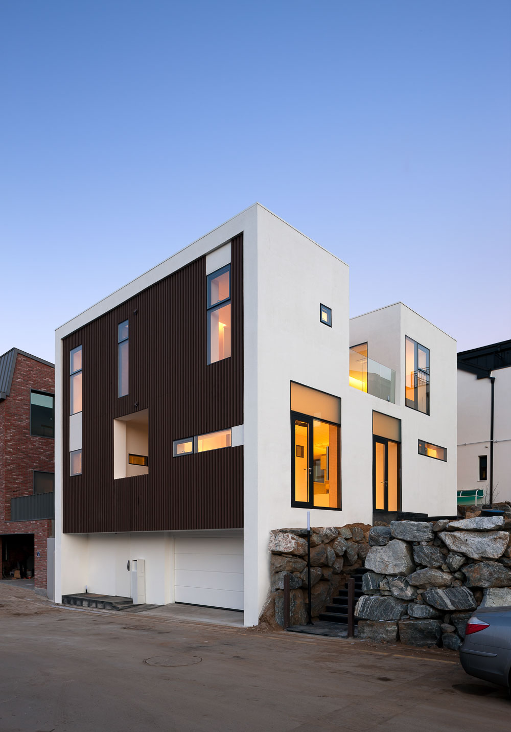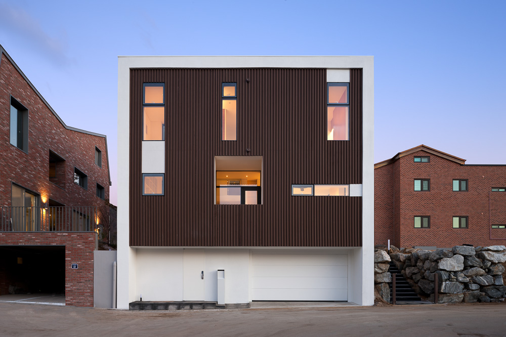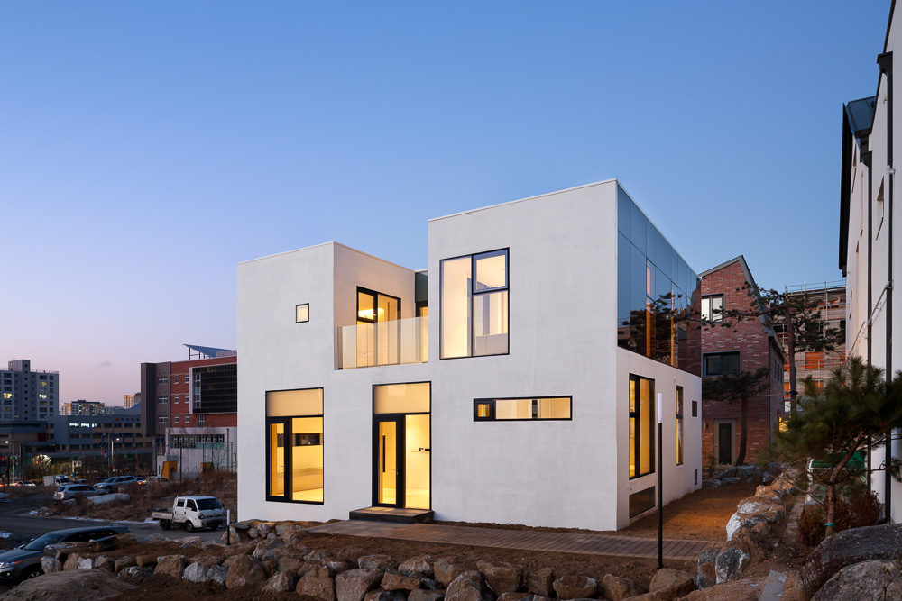 외부에서 보이는 입면은 최대한 단순하게 계획됐다. 흰색 친환경코팅 페인트 와 유리를 주로 사용했고, 도로측에서 보이는 서측면에는 합성목재를 적용했 다. 도로측에서 보이는 서측 입면이 건물의 주요한 인상을 주도록 디자인했다. 지하층에는 신발장 공간, 다목적 홀(체력 단련/AV), 실내 주차장을 계획했다. 1층은 거실과 손님방, 1.5층은 식당, 주방, 세탁실, 2층은 침실들이 있다. 지하 층 다목적 홀과 거실은 1.5개층으로 천장을 높게 했다. 1.5개층의 거실은 1개 층 높이의 식당·주방과 공간적으로 연결이 된다.