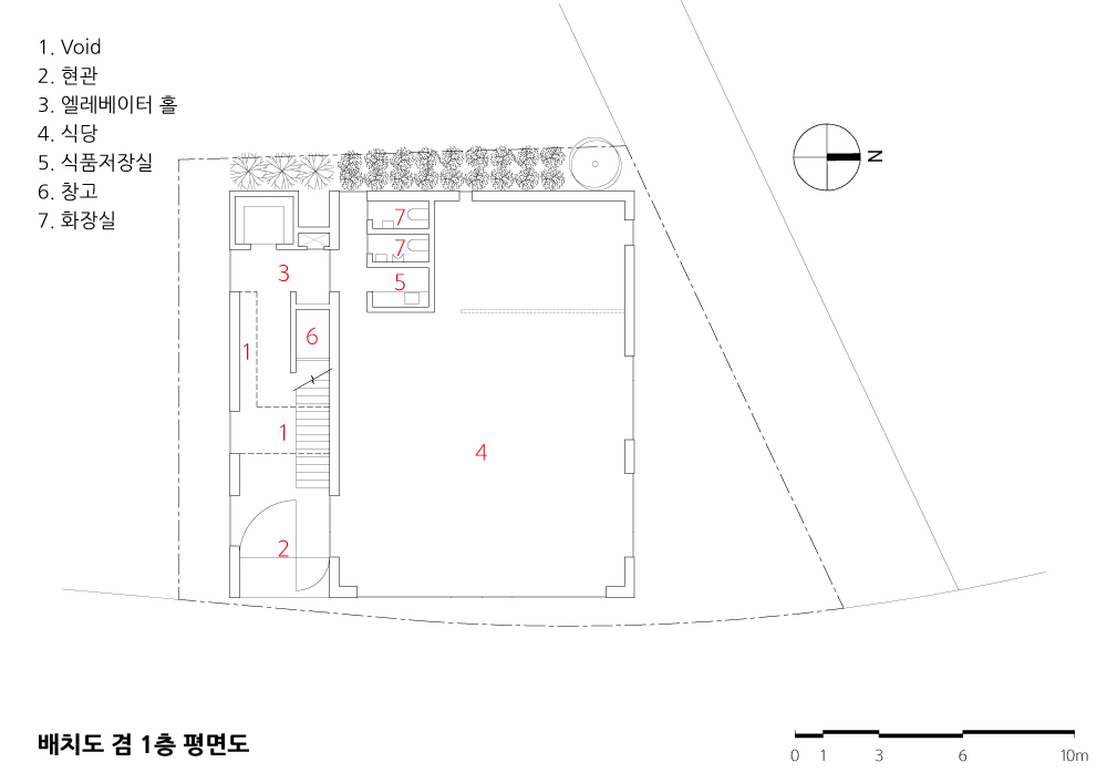 배치 대지는 동향이었으므로 주변은 근생시설이 있어서 동향으로 건물이 배치됐다. 사 다리꼴의 형태였으므로 건물 모서리 부분은 주차장으로 계획했다. 도로 측으로 주진입 구를 만들었다.