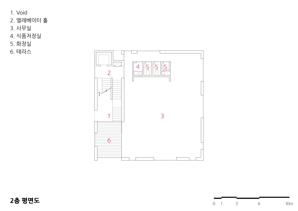 평면 동측 전면 도로 쪽으로 만든 주출입구의 진입공간을 건물의 내부까지 끌어 들여서, 계단과 엘리베이터, 상부 보이드 공간을 입체적으로 구성했다. 이 공간으로 모든 공간을 연결하도록 의도하여 방문자로 하여금 주출입공간의 극적인 느낌을 가질 수 있도록 계 획했다. 이 공간은 건물의 환기뿐 아니라, 빛이 내부까지 유입되도록 하는 역할도 한다.