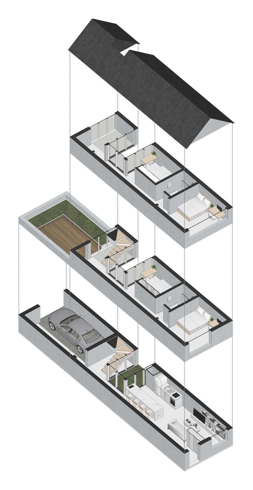 1. 3개층 또는 2개층의 구성으로 각각의 기능은 작지만 큰 공간 구성