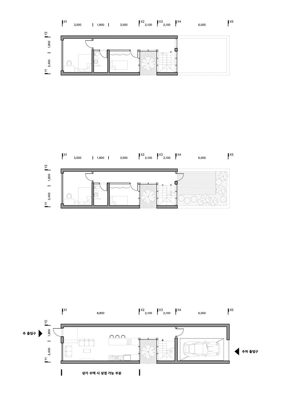 - 중정 강조형 또는 마당 타입으로 향후 1층 거실부분을 상점으로 전환 시 쉽게 용도 전환할 수 있도록 구성