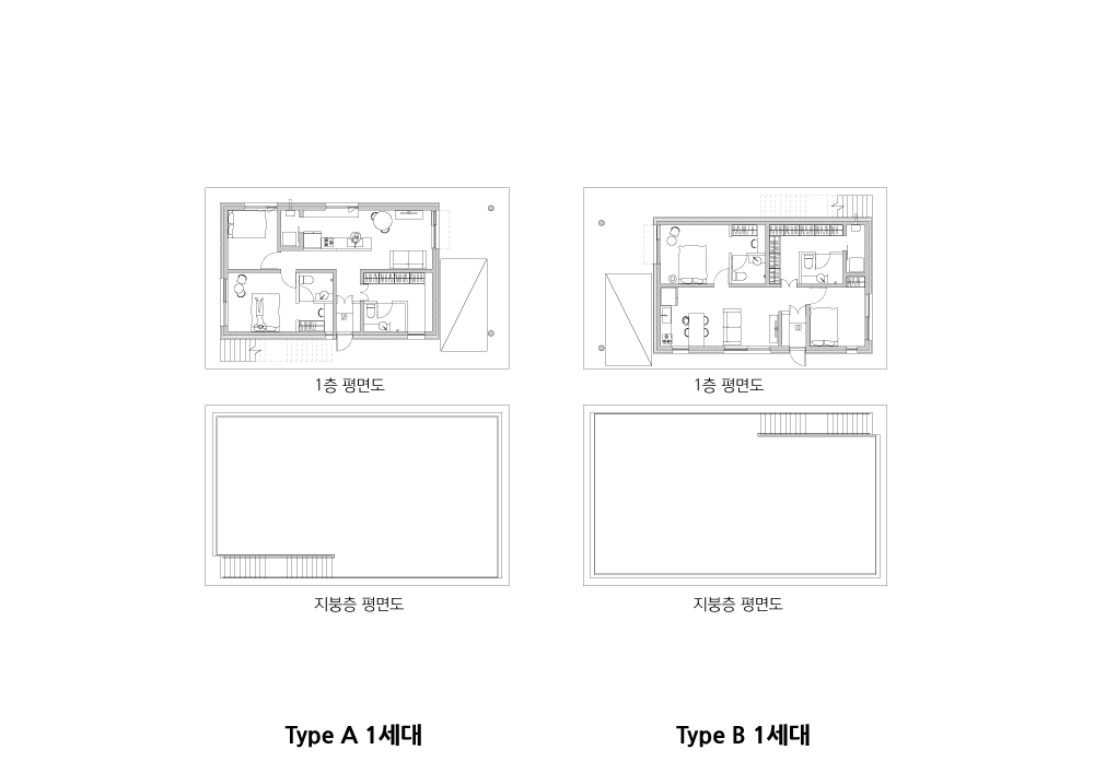 고성기준 피해주택 335채, 이재민 651명임을 고려하였을 때 피해세대 대부분이 3인 이하의 세대일 것으로 추정, 방 2~3개의 30평 미만 주택으로 한정하고, 1세 대 주택과 2세대주택 2가지 타입으로 기준 평면도를 만들어 다양한 조합으로 활 용할 수 있도록 한다. 2주택 이상의 주택은 근린생활시설을 2층에 배치하여 분양 받은 주민이 근린생활시설에서 자체적인 경제활동으로 인한 소득 또는 임대소득 을 얻거나 지역 지자체에서 운영하는 주민 생활지원 시설로 사용할 수 있다.