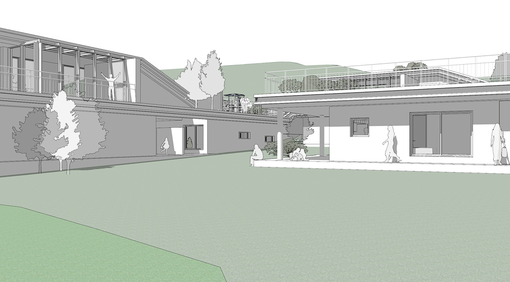 커뮤니티레벨(2층)은 각 동마다 근린생활시설과 외부데크가 있으며 외부데크 는 놀이터, 주민운동시설, 야외쉼터, 노천카페, 지역적특성을 고려하여 공동 농업 작업장 등 외부활동공간으로 활용할 수 있다. 3동 이상의 건물을 커뮤니티 레벨 에서 연결하고 어디에서든 접근할 수 있도록 하여 다양한 활동이 연계되어 일어 날 수 있게 유도하고 소수의 엘리베이터로도 다수의 커뮤니티 접근에 문제가 없 도록 한다. 피해지역은 대지의 고저차가 많은 지역이므로, 대지를 잘 활용한다면 커뮤니티 레벨에서 자연환경으로의 동선을 배치할 수 있다. 2층 커뮤니티 지붕 층은 자연과 함께 풍경으로 읽히도록 한다.