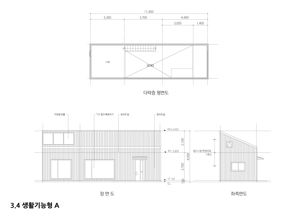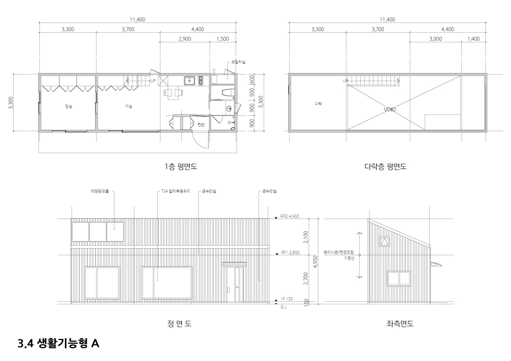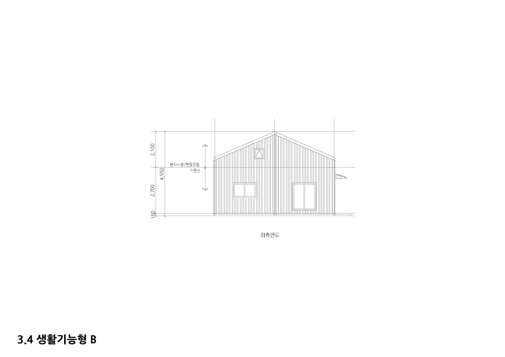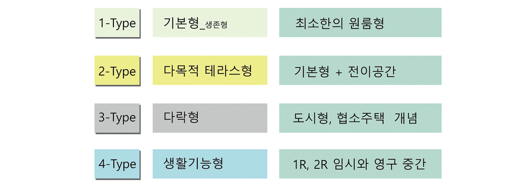 재해 재난을 당한 가족의 기본적인 생활이 가능하도록 가족수에 따라 1-2개의 침실이 제공되며, 거실과 주방(식사공간 포함)을 포함 세탁, 샤워와 같은 인간 본 연의 삶을 담아낼 수 있는 임시주택이다. 생활기능형은 신축 비용이 부족한 사례 를 고려하여 임시주택과 영구주택의 중간 레벨 또는 임시주택 반환기에 영구주 택으로 리모델링이 수월하도록 설계되어 추가적으로 외단열과 지붕 덧시공 등으 로 10년 이상 사용할 수 있는 반영구주택 모듈과 디테일이 착안되어야 한다. 기 본형을 확장한 유형으로 2-3개 모듈을 조합할 수도 있다. 재원마련은 신축비용 의 지원금과 건축협동조합, 사랑의 집짓기, 지역내 사회봉사활동그룹 등 지역 네 트워크를 엮어서 추진동력을 찾을 수 있다. 또한 특정 지역이나 마을에 대형재난 발생 시 연립주택 형태의 로우 하우스(Low house)로 마당과 창고, 생활 기반시 설을 공유하는 한시적 저렴주택에 대한 집중 연구가 실증조사와 개발로 지속될 필요가 있다. 컨테이너형 연립이나 쉐어하우스 형식의 시도가 설문조사와 거주 후평가에 의한 시범사업 적용 후 확산 보급될 수 있을 것이다.