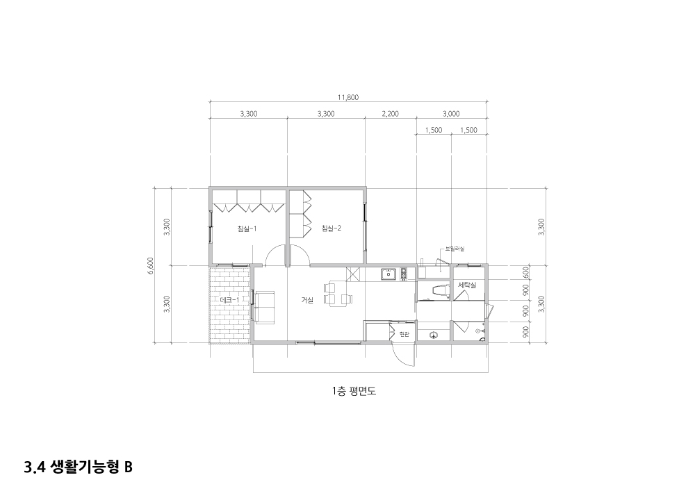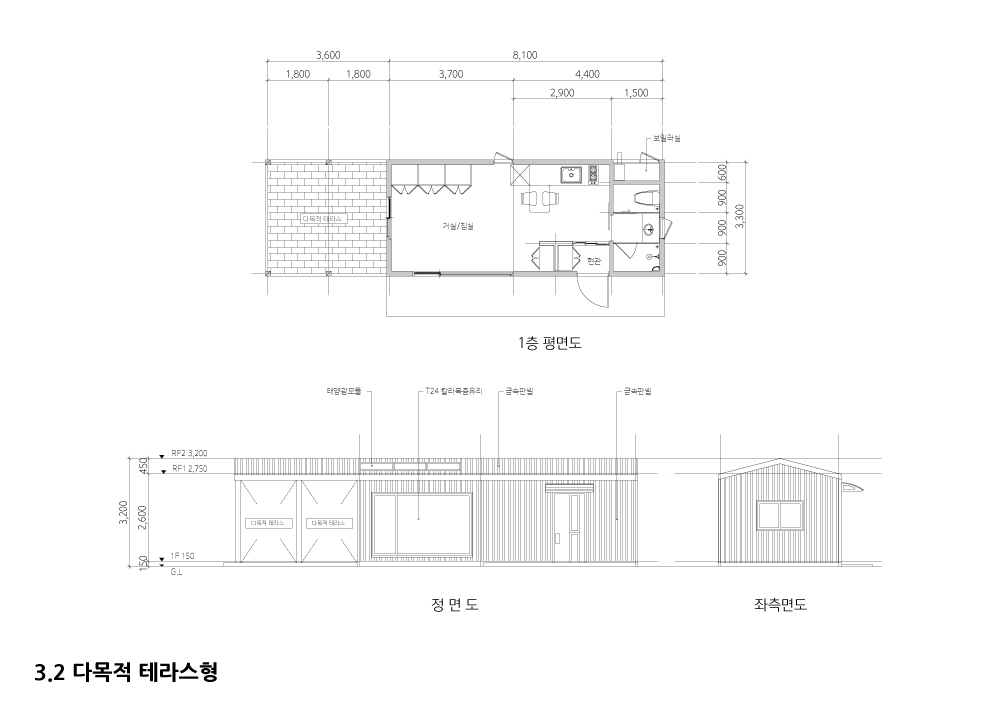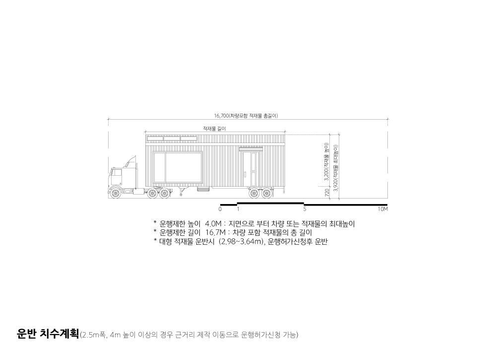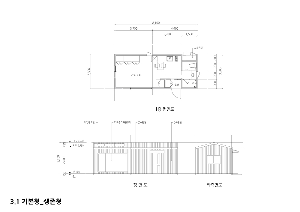 국내 도로, 고가도, 교량, 터널, 마을진입로 등 모든 여건을 고려하여 8.1m X 3.3m(26.73㎡), 3M 모듈을 적용하여 L+D+K+T+Ba 원룸형으로 인간이 생존 가능한 최소한의 유형이다. 방이 없으므로 프라이버시 확보가 곤란하고, 생수, 휴 지, 각종 박스 등 지원물품의 창고처럼 될 가능성이 크므로 가능한 1인 가구에 한 정하되 창고를 별도로 지원하여야 한다.