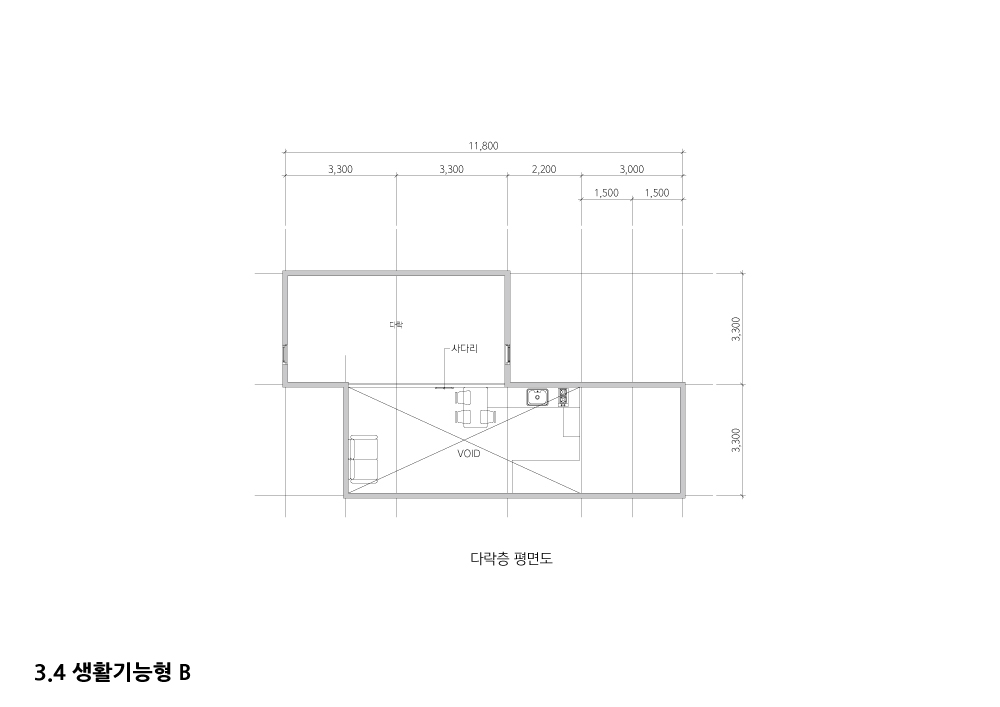 지진과 같은 도시형 재난에서 중장년 가구에게 협소주택처럼 좁지만 프라이버시 가 확보되는 다락을 두어 잠자리 및 수납 공간으로 지원될 수 있다. 다락은 1층과 별도로 추가모듈로 공장제작 후 이동되어 현장에서 결합 시공하는 방안이다.