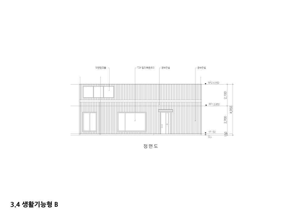 재해 재난을 당한 가족의 기본적인 생활이 가능하도록 가족수에 따라 1-2개의 침실이 제공되며, 거실과 주방(식사공간 포함)을 포함 세탁, 샤워와 같은 인간 본 연의 삶을 담아낼 수 있는 임시주택이다. 생활기능형은 신축 비용이 부족한 사례 를 고려하여 임시주택과 영구주택의 중간 레벨 또는 임시주택 반환기에 영구주 택으로 리모델링이 수월하도록 설계되어 추가적으로 외단열과 지붕 덧시공 등으 로 10년 이상 사용할 수 있는 반영구주택 모듈과 디테일이 착안되어야 한다. 기 본형을 확장한 유형으로 2-3개 모듈을 조합할 수도 있다. 재원마련은 신축비용 의 지원금과 건축협동조합, 사랑의 집짓기, 지역내 사회봉사활동그룹 등 지역 네 트워크를 엮어서 추진동력을 찾을 수 있다. 또한 특정 지역이나 마을에 대형재난 발생 시 연립주택 형태의 로우 하우스(Low house)로 마당과 창고, 생활 기반시 설을 공유하는 한시적 저렴주택에 대한 집중 연구가 실증조사와 개발로 지속될 필요가 있다. 컨테이너형 연립이나 쉐어하우스 형식의 시도가 설문조사와 거주 후평가에 의한 시범사업 적용 후 확산 보급될 수 있을 것이다.