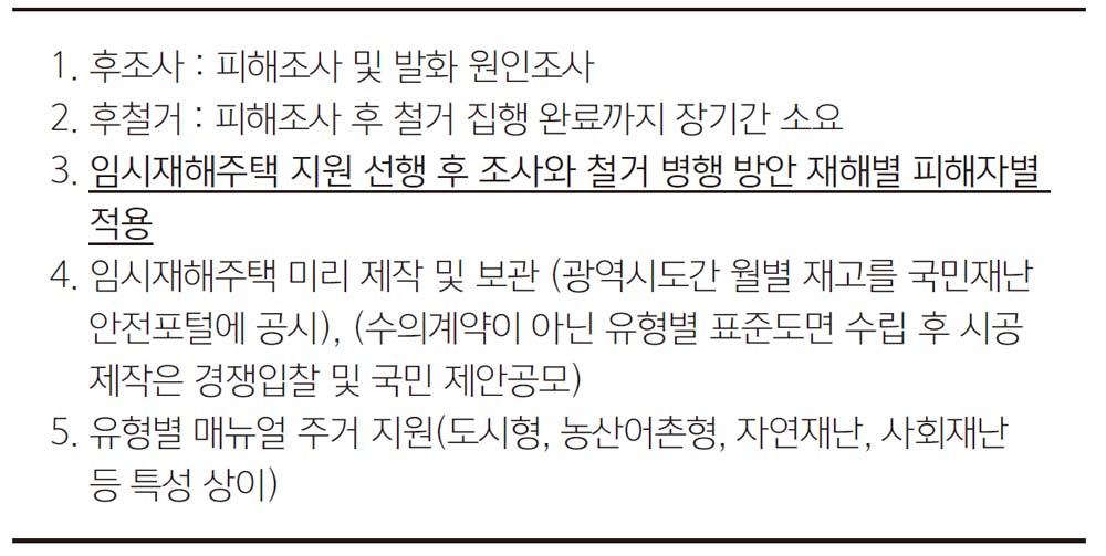첫째, 대피소와 이재민 텐트의 생활은 일반인은 물론 노약자, 장애인, 영유아 가 구에겐 식생활과 화장실 등 여러 환경때문에 지내는 기간이 시간으로 짧을수록 좋다. 신속 지원을 위해 재해극복용 임시주택을 미리 제작 <국민재난안전포털> 에 시도별로 비축 공시해놓고 48시간 내 재해현장 지원체계를 구축한다.