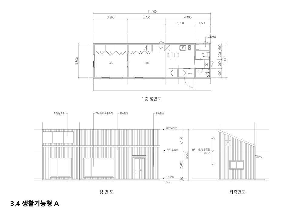 국내 도로, 고가도, 교량, 터널, 마을진입로 등 모든 여건을 고려하여 8.1m X 3.3m(26.73㎡), 3M 모듈을 적용하여 L+D+K+T+Ba 원룸형으로 인간이 생존 가능한 최소한의 유형이다. 방이 없으므로 프라이버시 확보가 곤란하고, 생수, 휴 지, 각종 박스 등 지원물품의 창고처럼 될 가능성이 크므로 가능한 1인 가구에 한 정하되 창고를 별도로 지원하여야 한다.