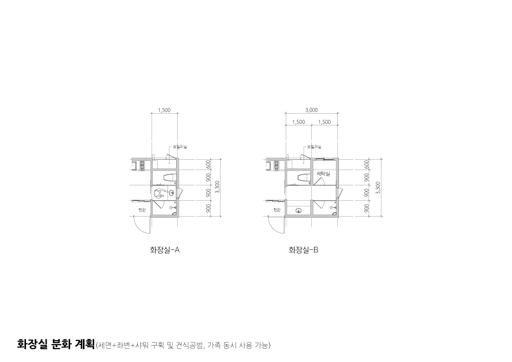 셋째, 임시주택은 1년 단위 연장가능한 가설건축물로서 건설폐기물이 될 콘크리 트나 시멘트계 모르타르, 습식 타일 사용을 자제하고 건식 시공법, 건식 화장실 로 공간 구획하며, 반납 시 리사이클과 업사이클 가능성과 수월성을 확보한다.