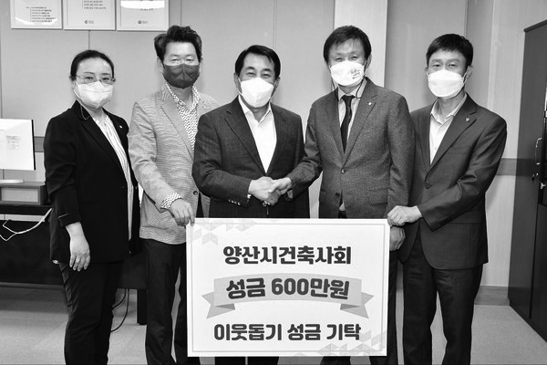 경상남도건축사회 양산지역건축사회는 지난 9월 27일 양산시에 불우이웃돕기 성금 600만 원을 기탁했다. 성금기탁식에 참여한 정진관 양산지역건축사회장은 경남건축문화제를 양산에서 개최하는데 도움을 준 것 에 대해 나동연 양산시장에게 감사의 뜻을 전하며, 양산시에 대규모 전시, 공연장 등의 문화시설이 필요하다 고 건의했다. 한편, 이날 전달된 성금은 지역아동센터를 비롯한 어려운 이웃과 단체에 전달될 예정이다.