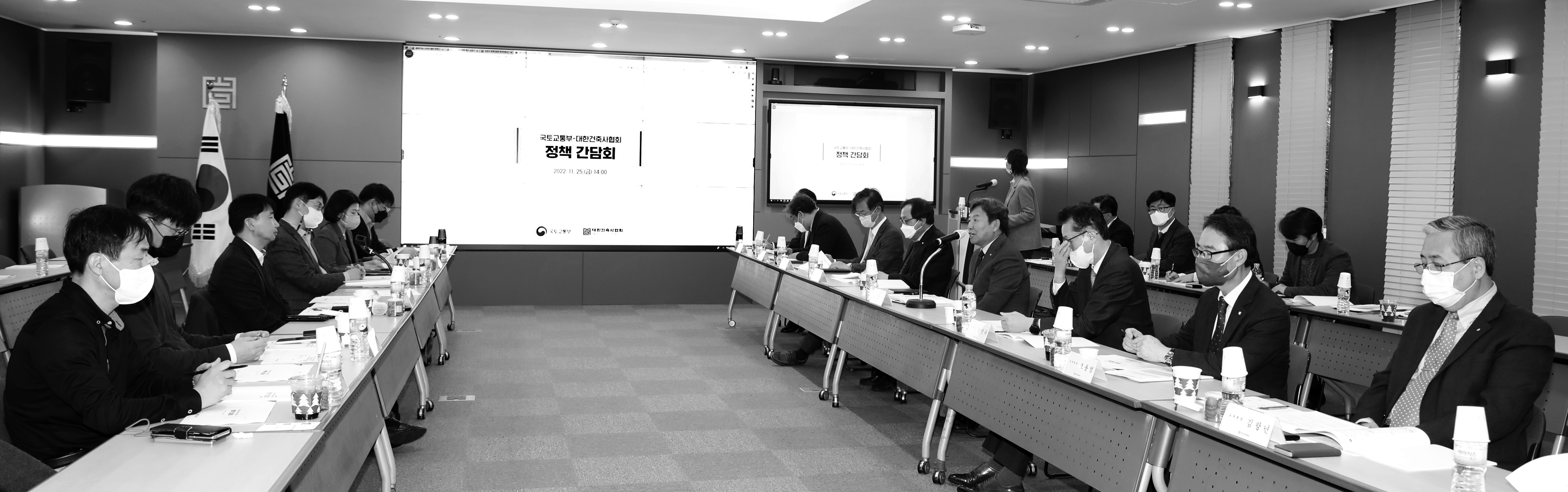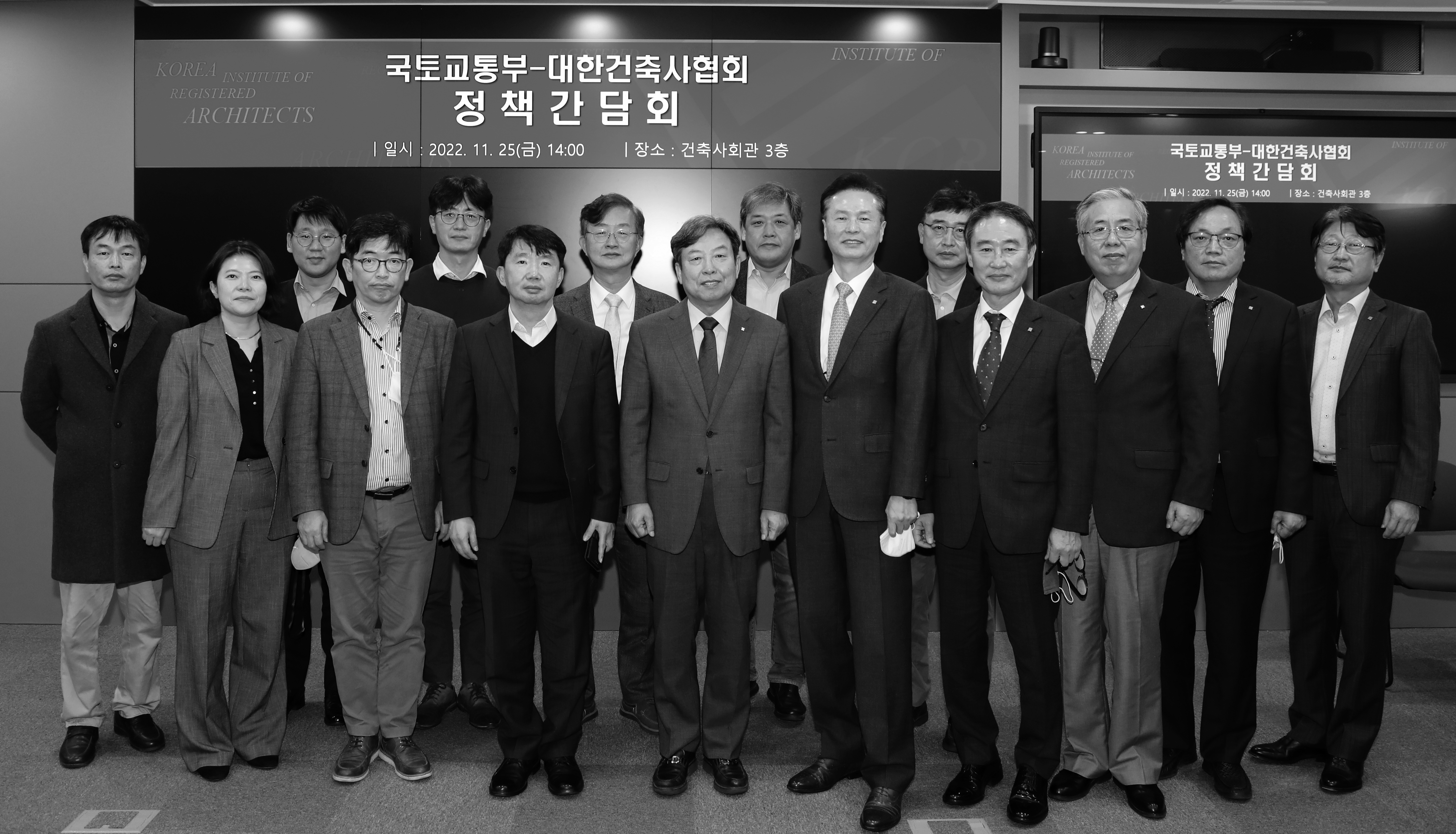 대한건축사협회가 지난 11월 25일 국토교통부와 정책간담회를 갖고 건축사업계 애로사항과 건의과제·발전 방안을 논의했다. 이날 간담회에 국토교통부는 엄정희 건축정책관을 비롯해 이진철 건축정책과장, 박기범 건 축문화경관과장, 김연희 건축안전과장, 조관우 건축정책과 사무관, 정우갑 녹색건축과 사무관이 참석했다. 협회는 석정훈 본협회장을 포함한 권연하·정종식 부회장, 정태화 상근부회장, 조용범 등록원장, 김항년 교 육원장, 박성준·정창호 이사, 은동신 BIM친환경건축위원회 위원장이 참석했다.